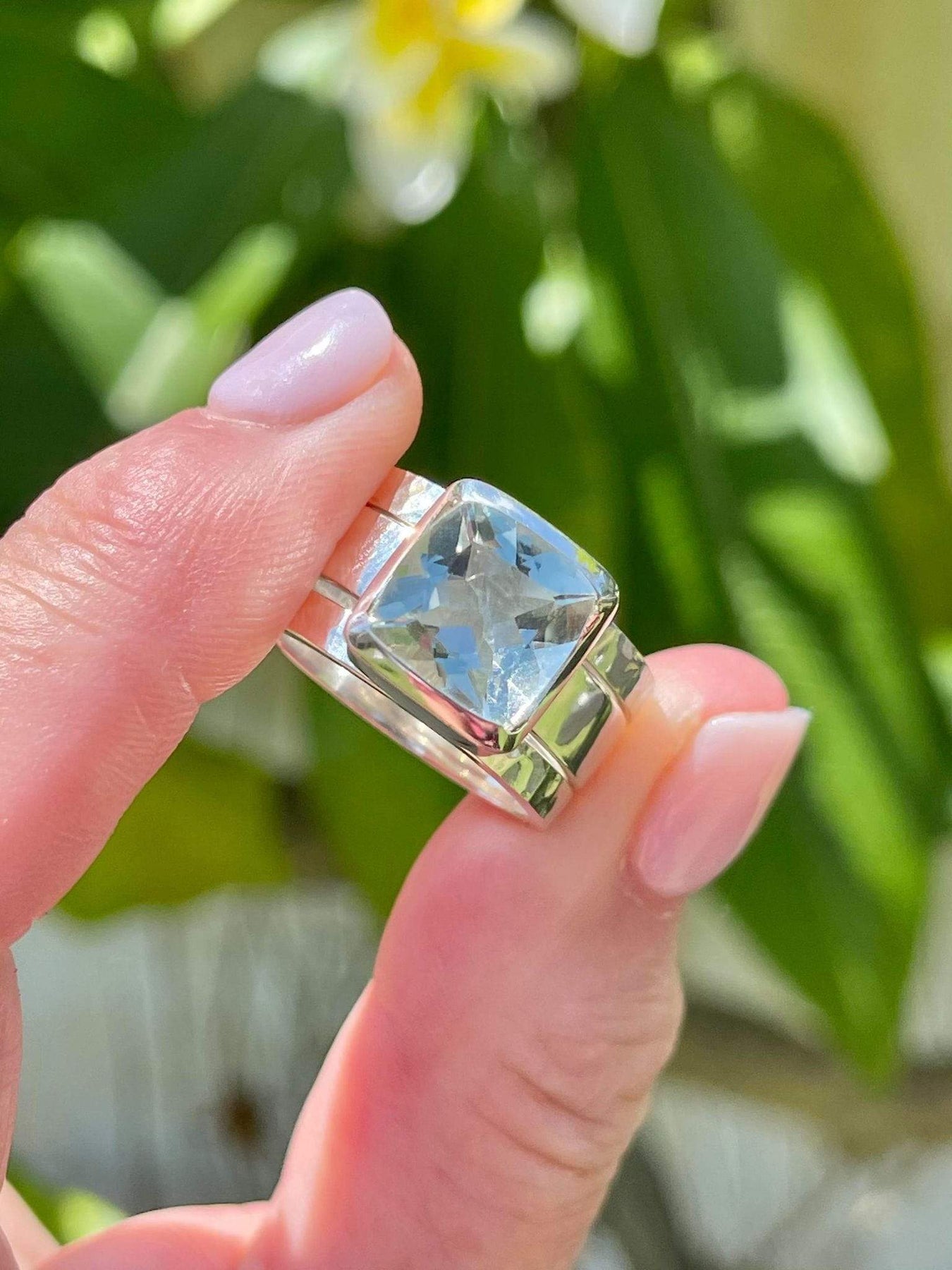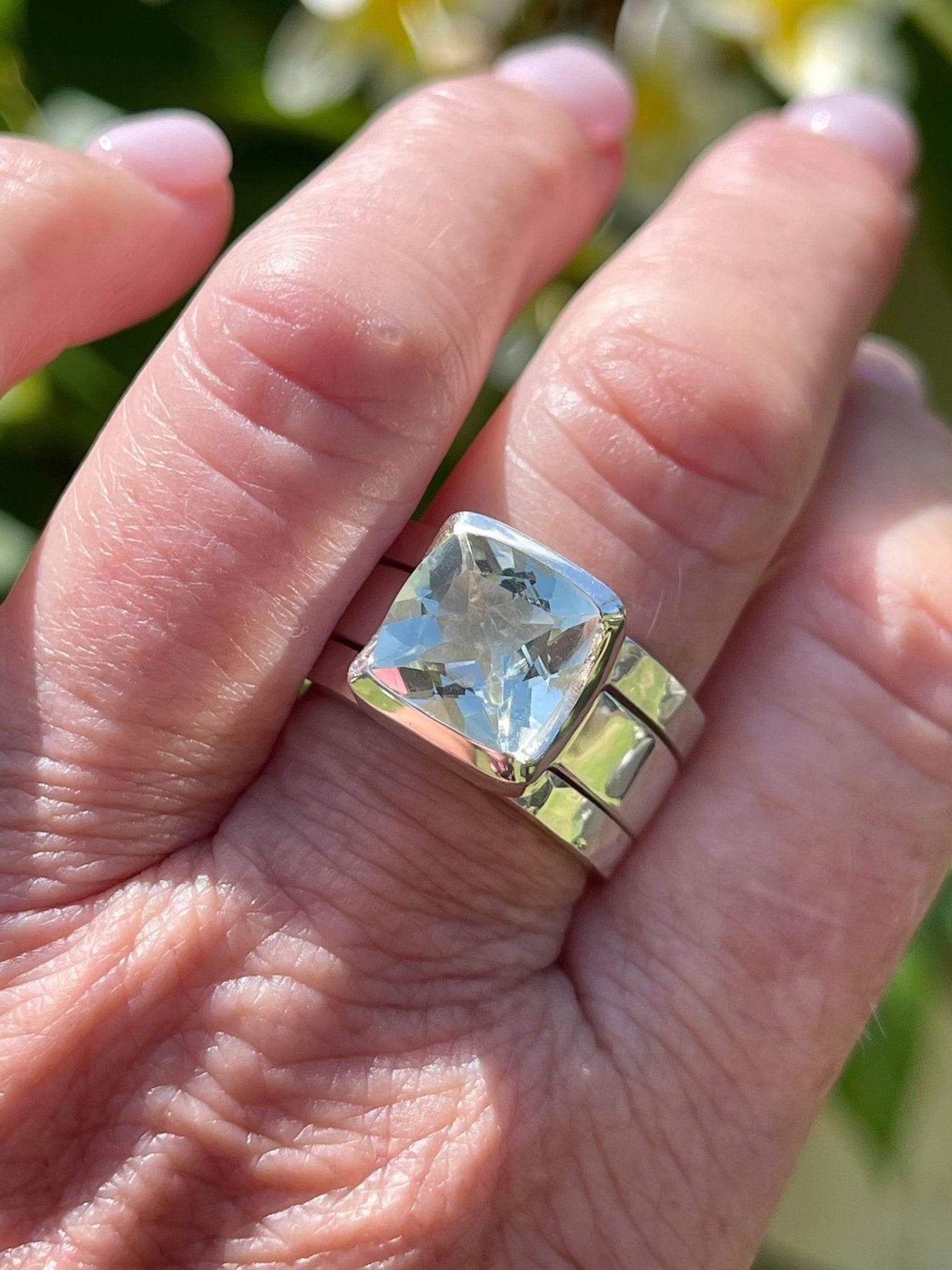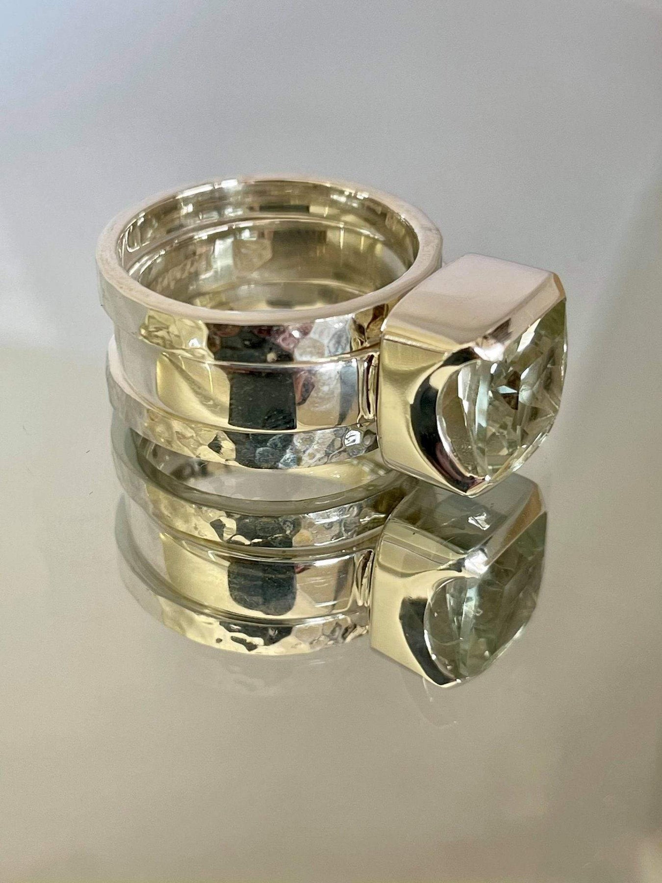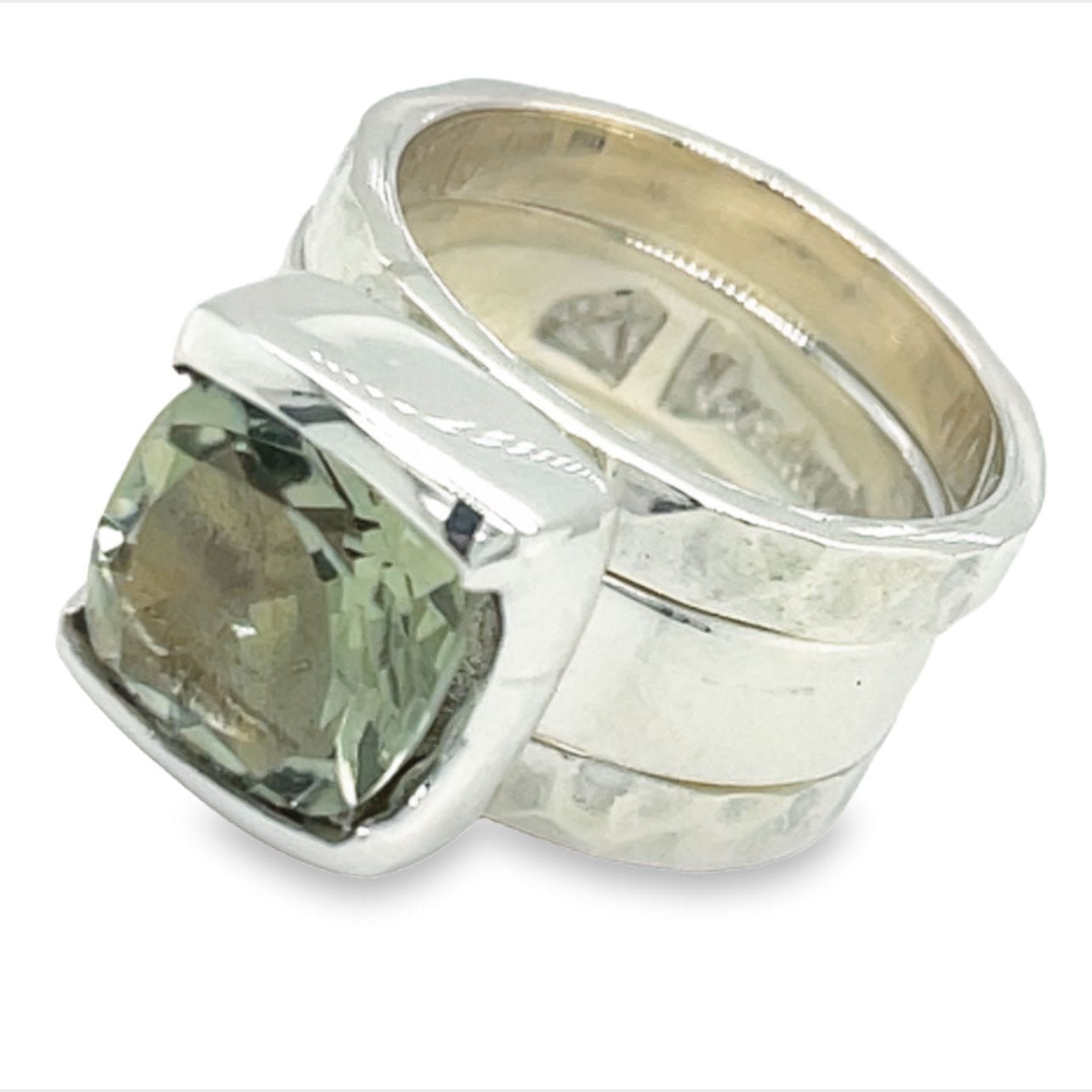 The square-cut gemstone ring with a 10 x 10 MM prasiolite is stunningly beautiful and offsets the two sterling silver beaten stacker bands perfectly. They can be worn as a trilogy set or on their own - the choice is yours.  These are absolute perfection.