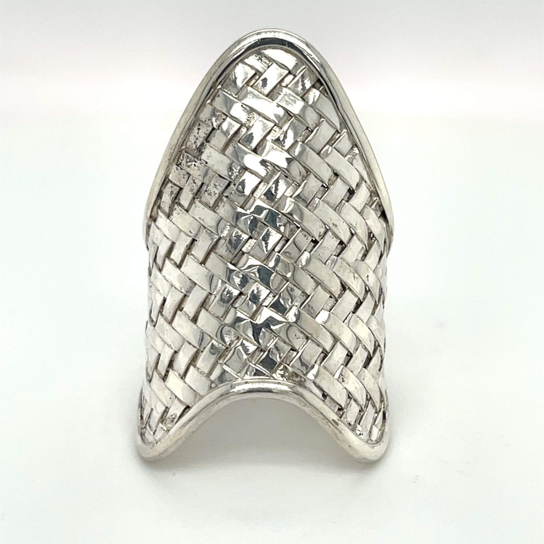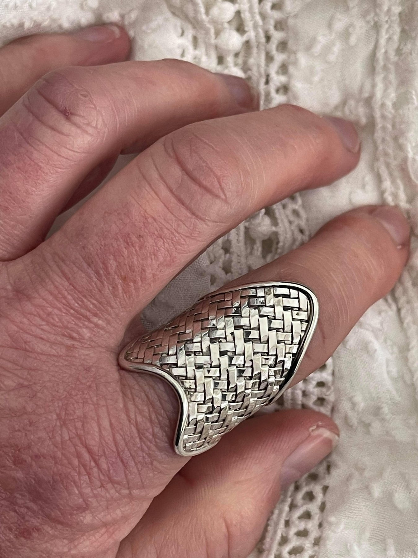 Made with sterling silver strips and painstakingly handwoven to create a basket weave pattern. They are available in two adjustable sizes (large or small) they fit beautifully on any finger.