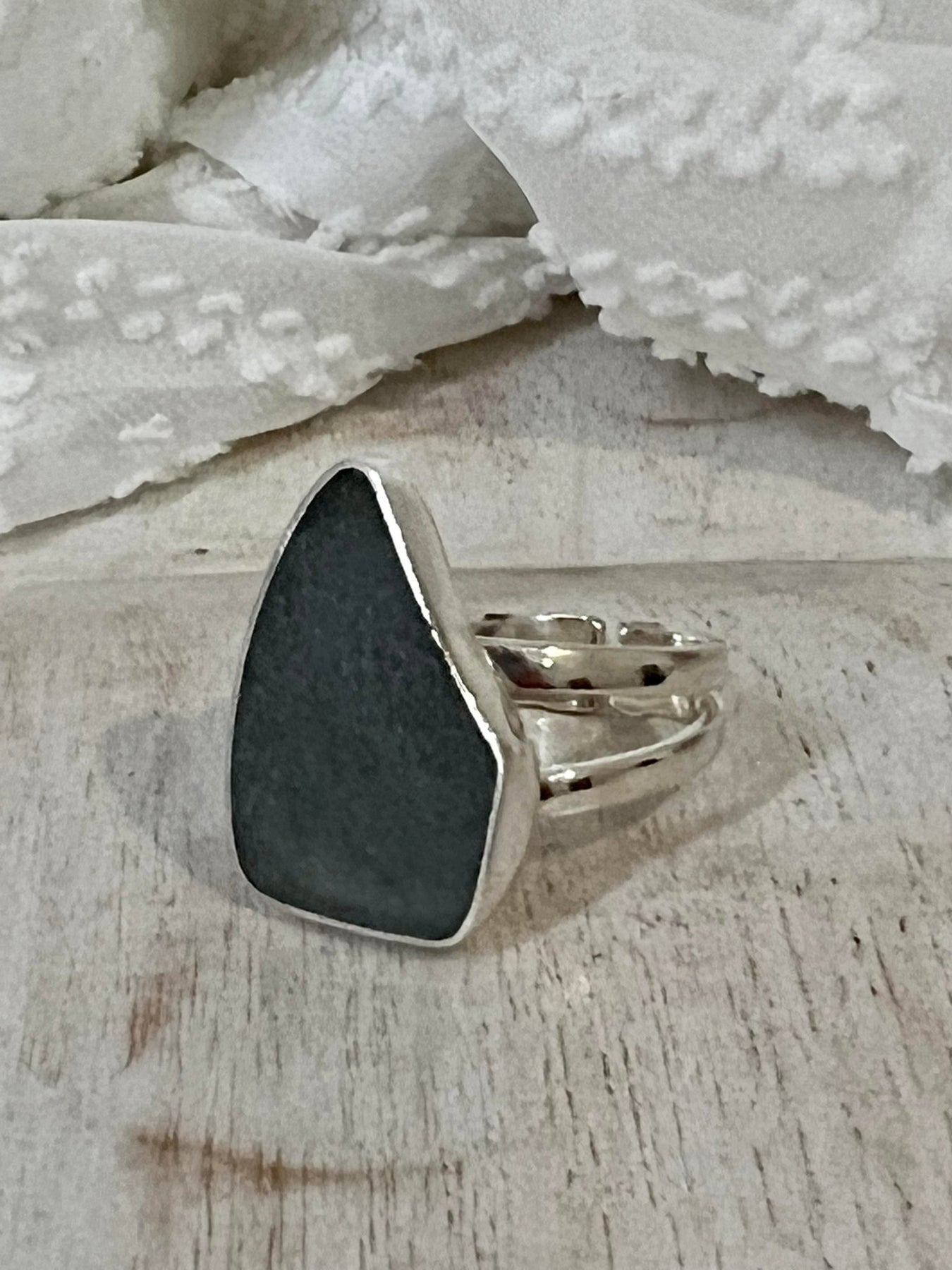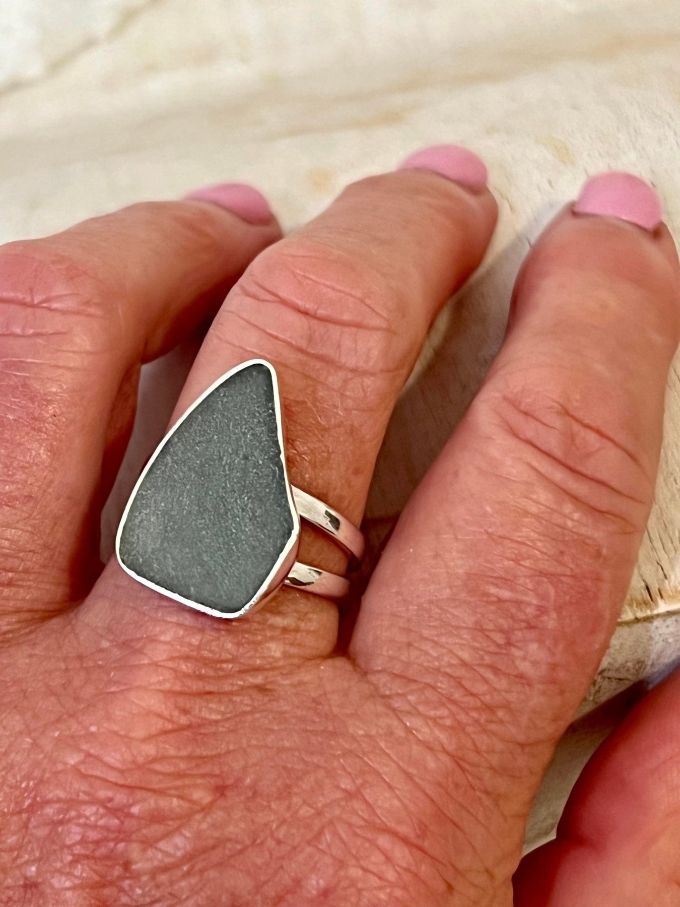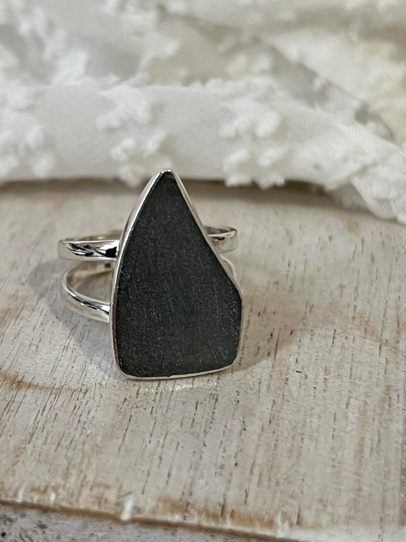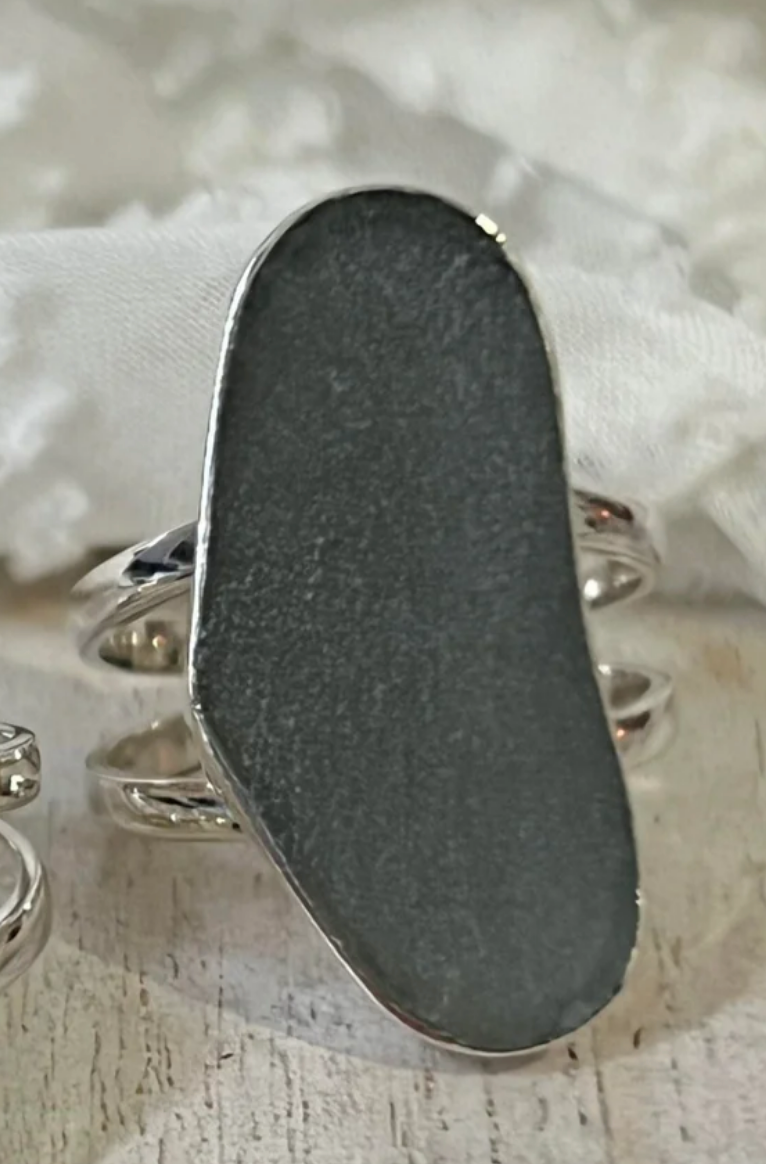 This restrained, yet high-impact ring has hidden secrets lurking within its murky depths. What began as unwanted scrap glass on the beach is now a beautiful ring in a balanced shade of grey.