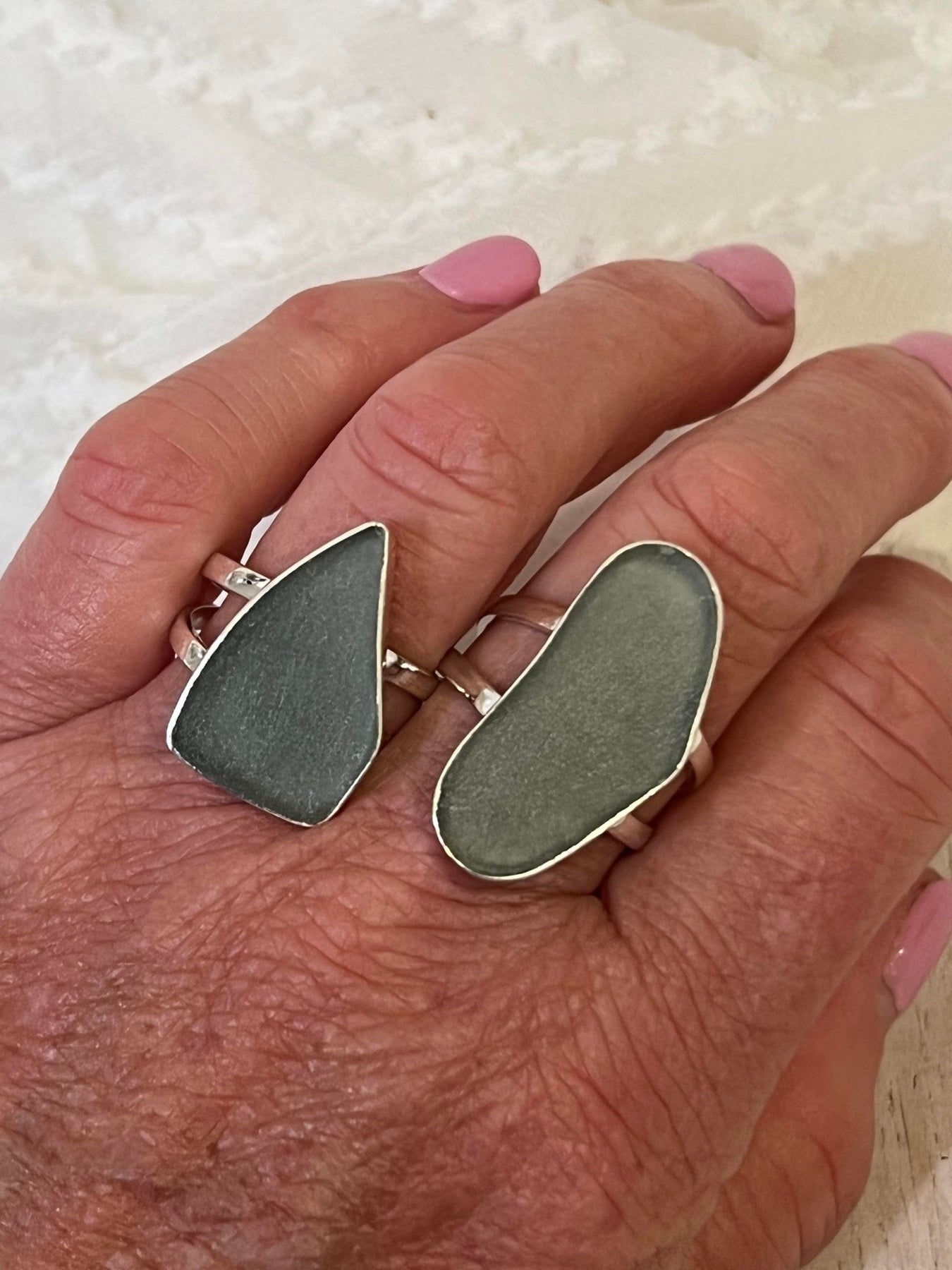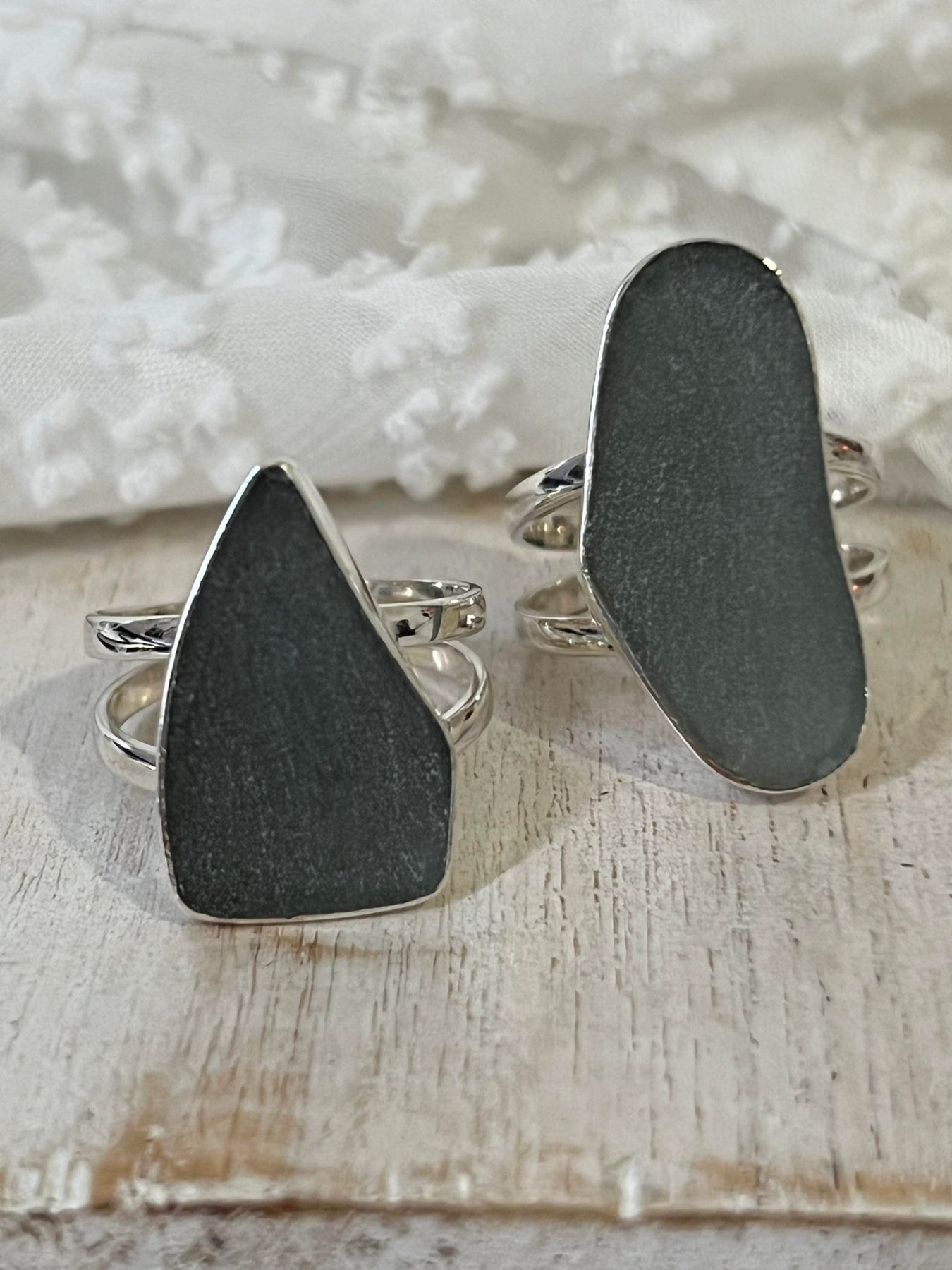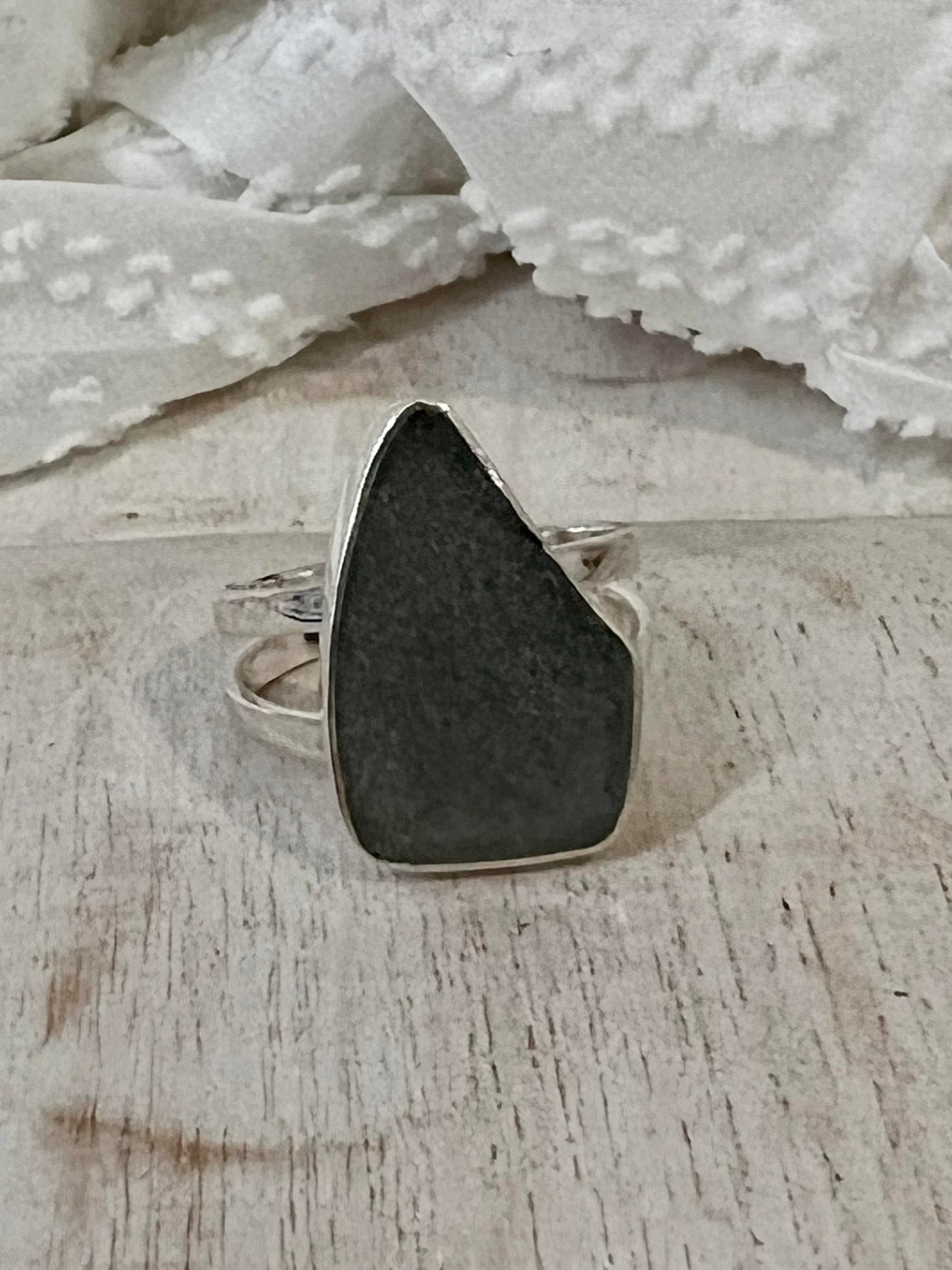 This restrained, yet high-impact ring has hidden secrets lurking within its murky depths. What began as unwanted scrap glass on the beach is now a beautiful ring in a balanced shade of grey.