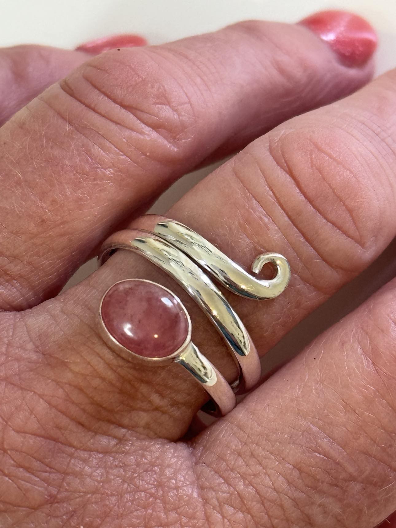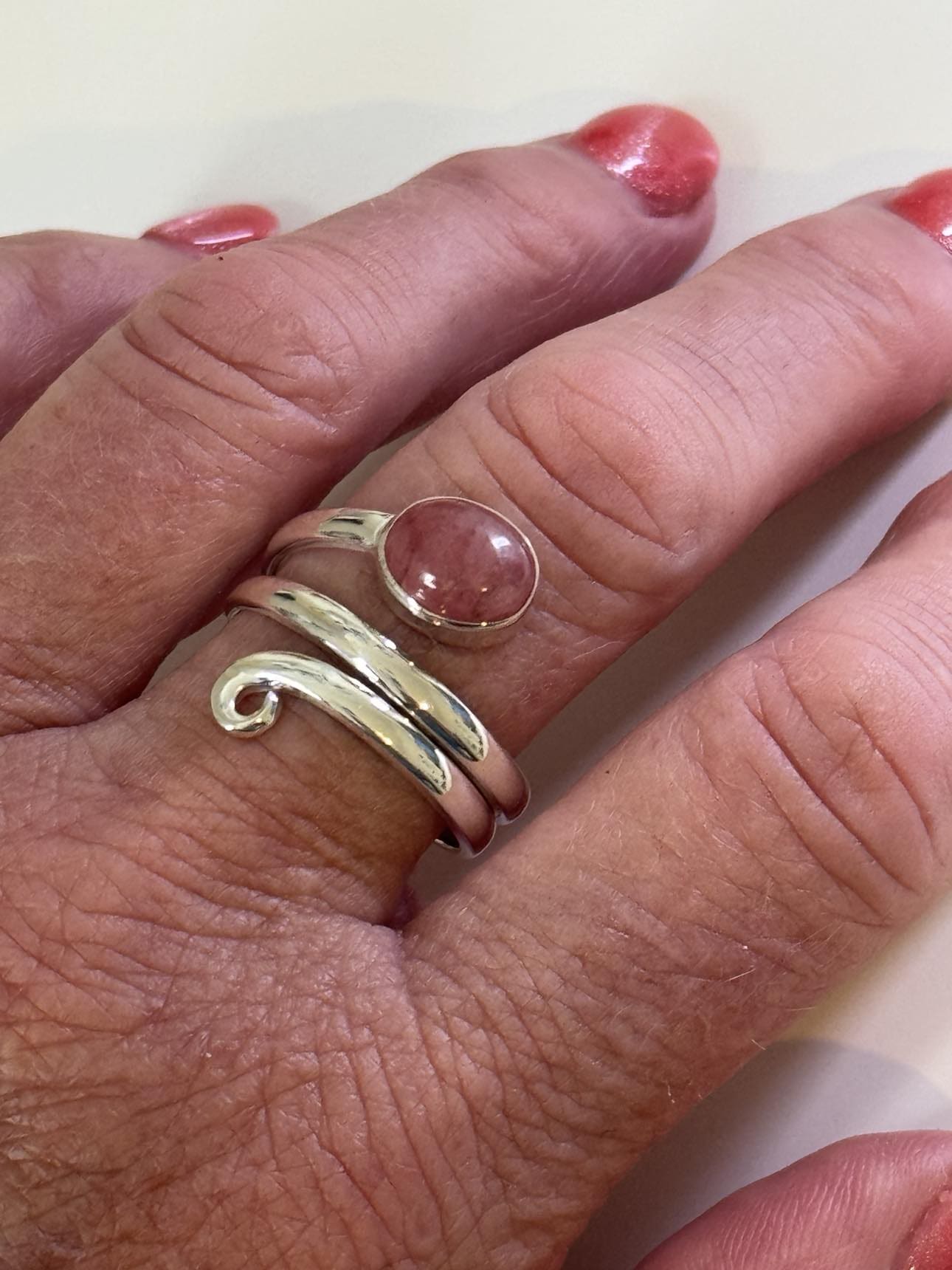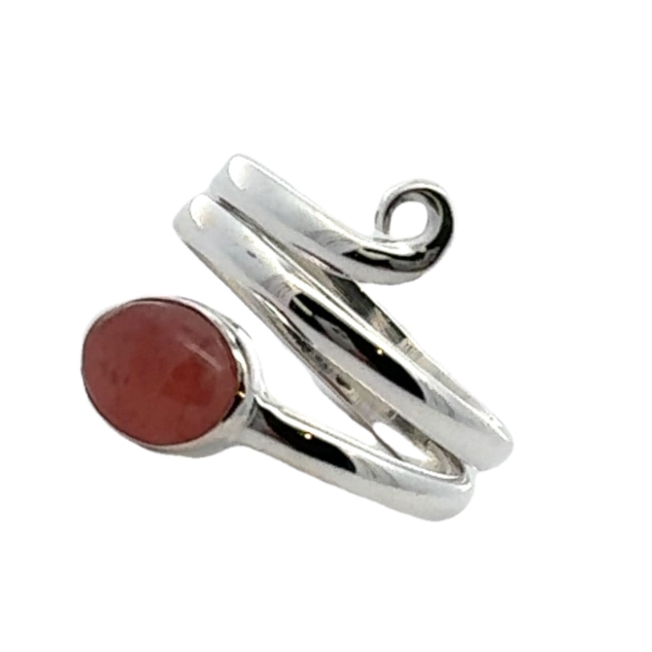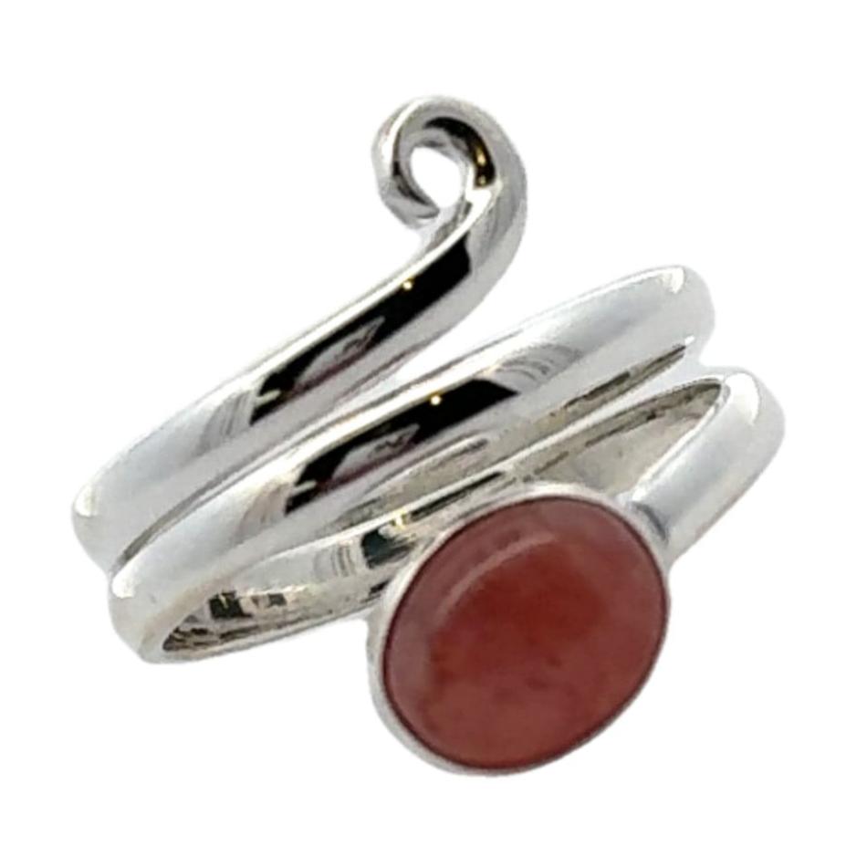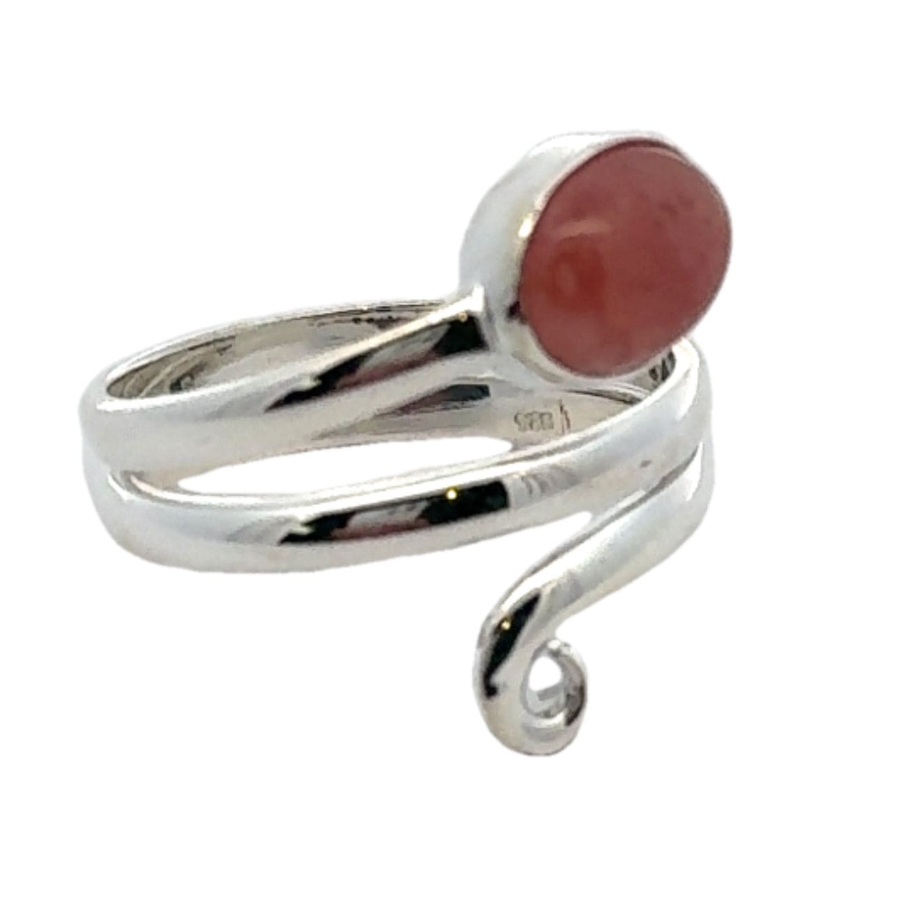 It’s boho, beautiful and beguiling! This show-stopping ring features a unique sterling silver swirl and a pretty pink rhodochrosite gemstone. With the cabochon oval stone at one end, the sterling silver cascades around your finger and ends with a flourish of silver swirl, offering a truly unique ring design.