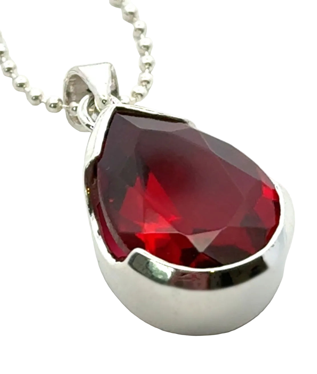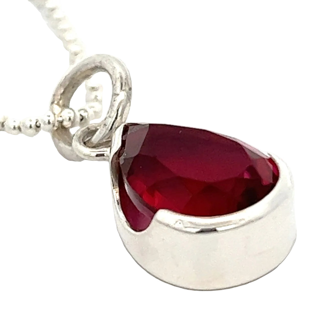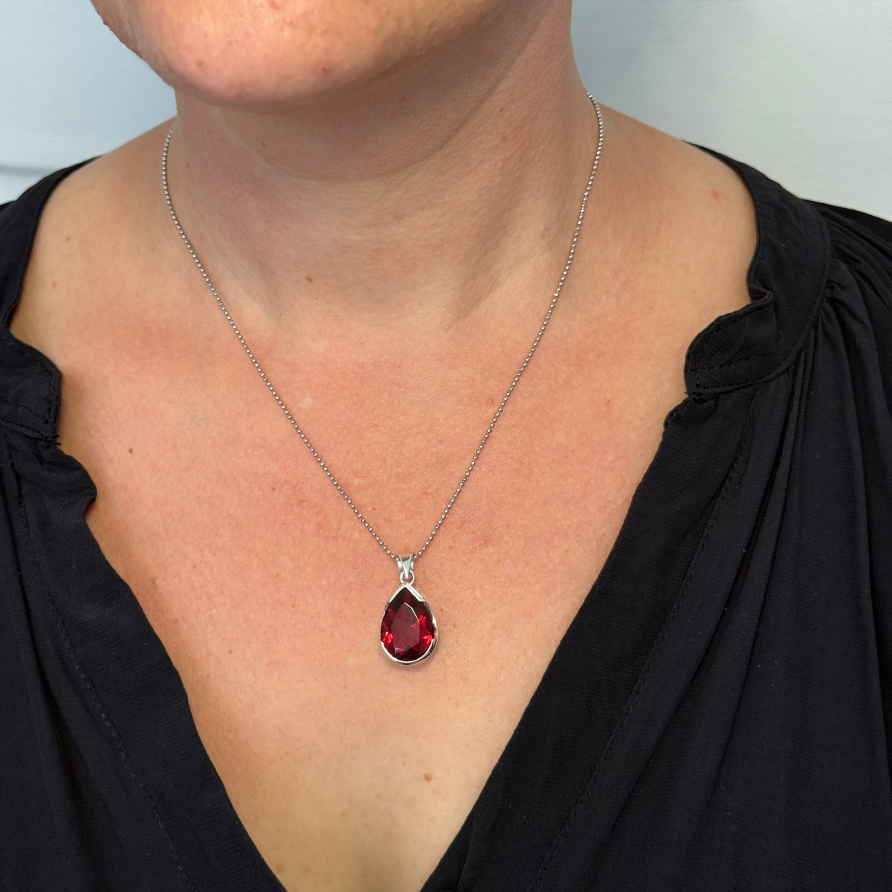 This striking Ruby Teardrop Pendant is the ultimate blend of bold colour and timeless elegance. The luminous light-red facet-cut ruby quartz (18 x 13 mm) radiates warmth and confidence, making it a flattering choice for every skin tone. Its classic teardrop silhouette ensures this piece will remain a favourite for years to come.