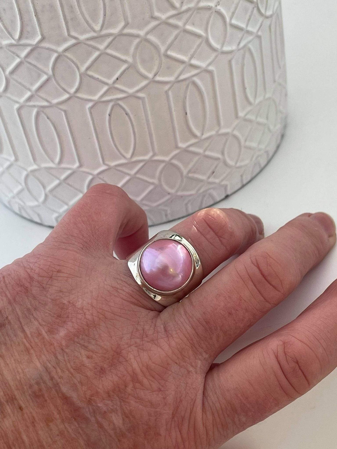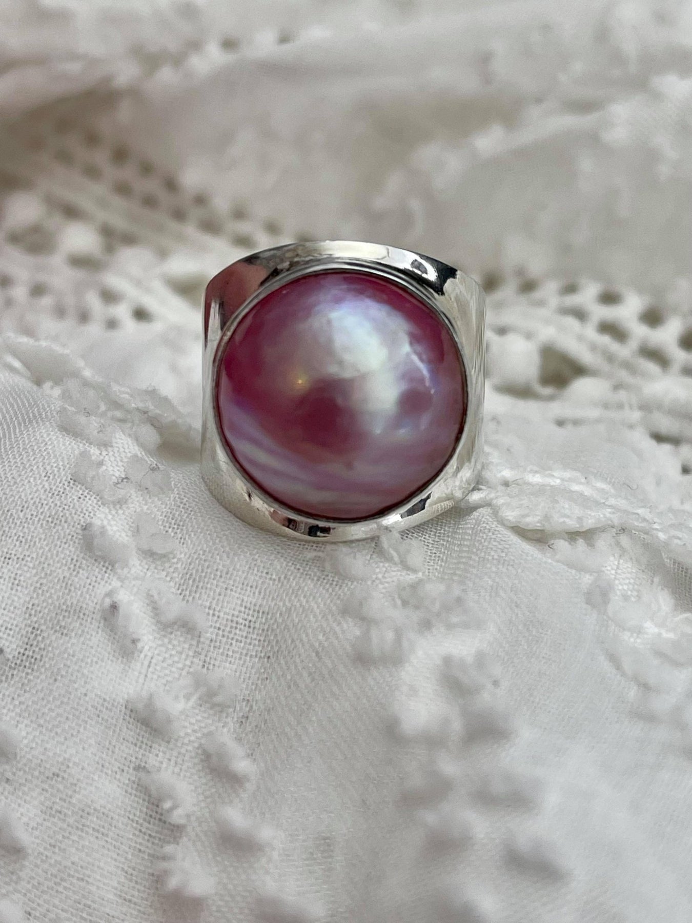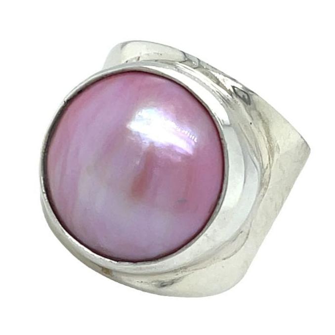 This silver ring showcases a stunning pink pearl that pairs beautifully with the Desiderate Under the Sun pink pearl earrings.