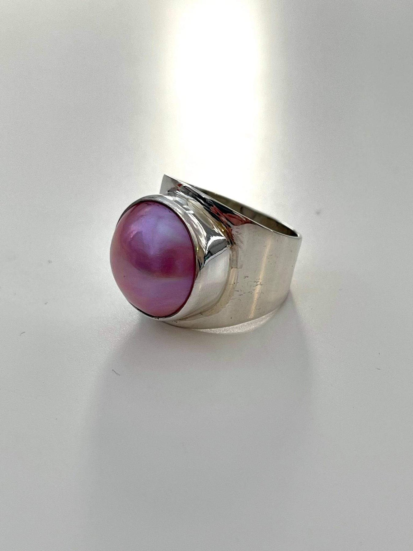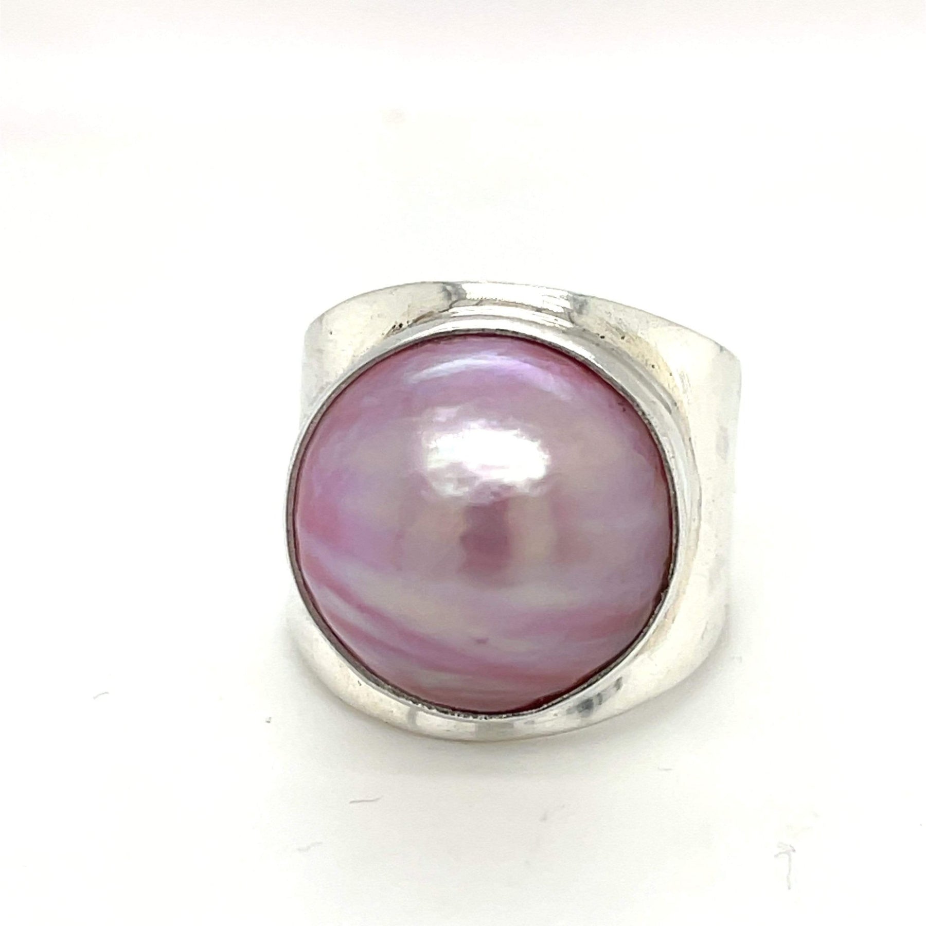 Baroque Pearls are fascinating natural gems and the thick sterling silver band is something we like as it really stands out on the hand.