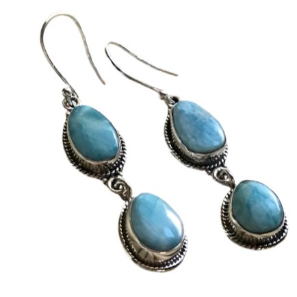 Pieces of freeform Larimar have been chosen and then handcrafted with sterling silver to create these incredible earrings. The drop is about 55 MM so they will be noticed!