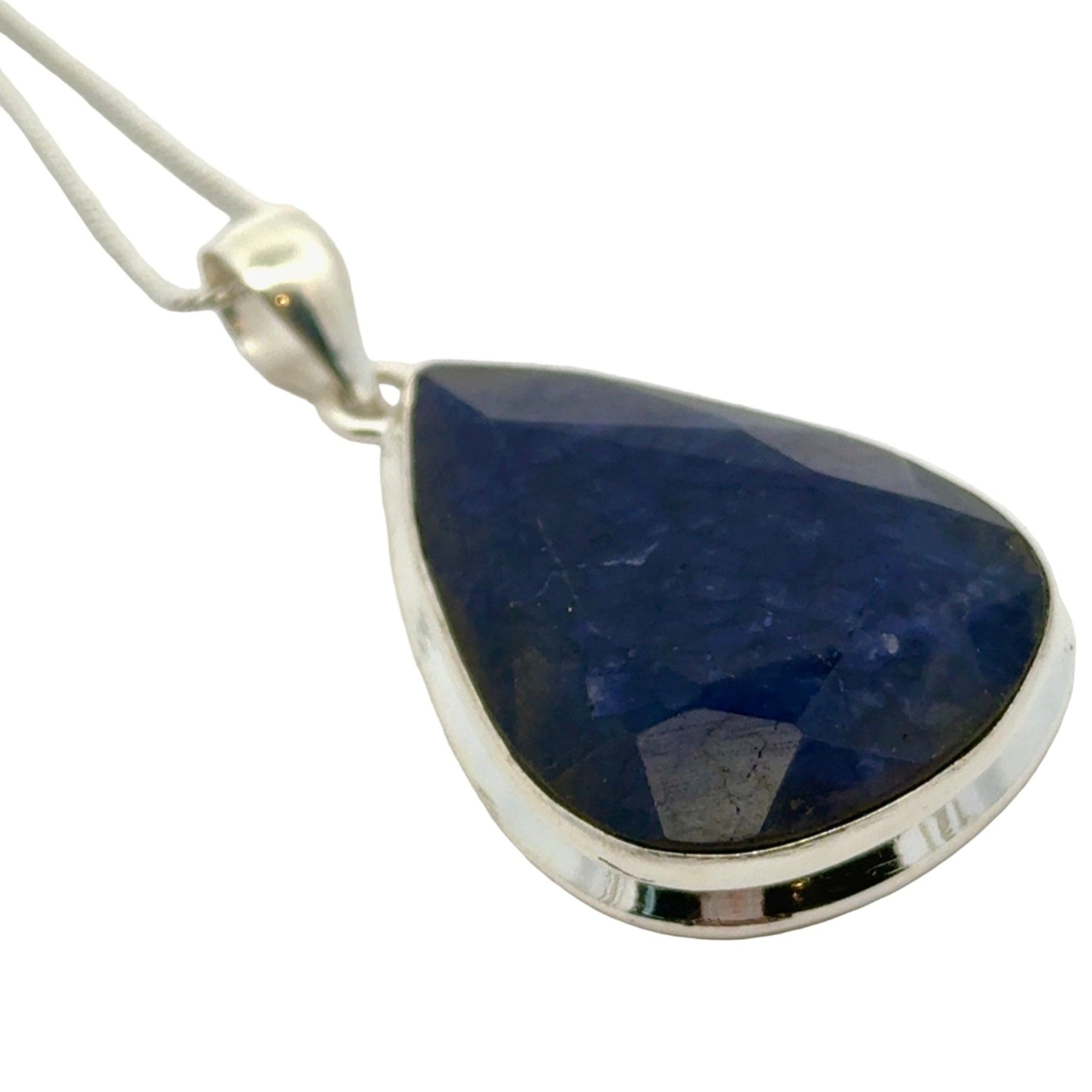 Set in sterling silver this teardrop sapphire measures a hefty 35MM x 25 MM and comes with a complimentary sterling silver chain to sit boldly on the decolletage. These are natural sapphire, not heat treated and are opaque and have imperfections visible, all part of the unique beauty.