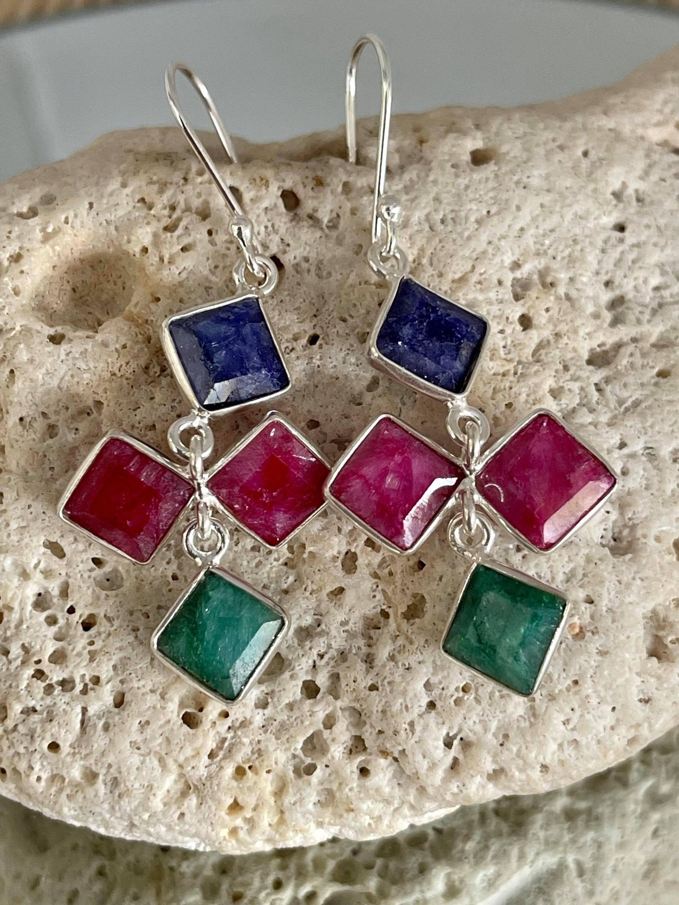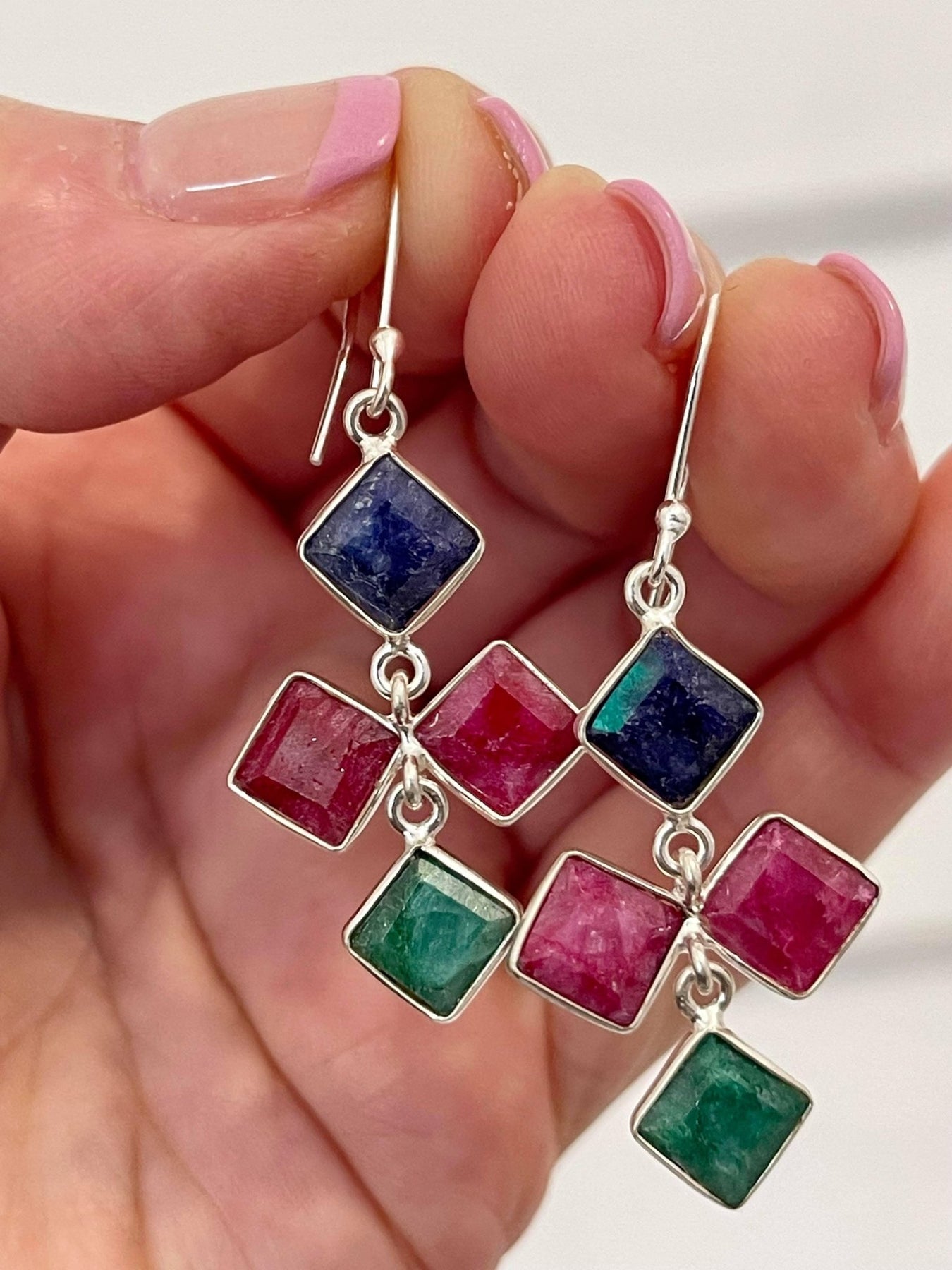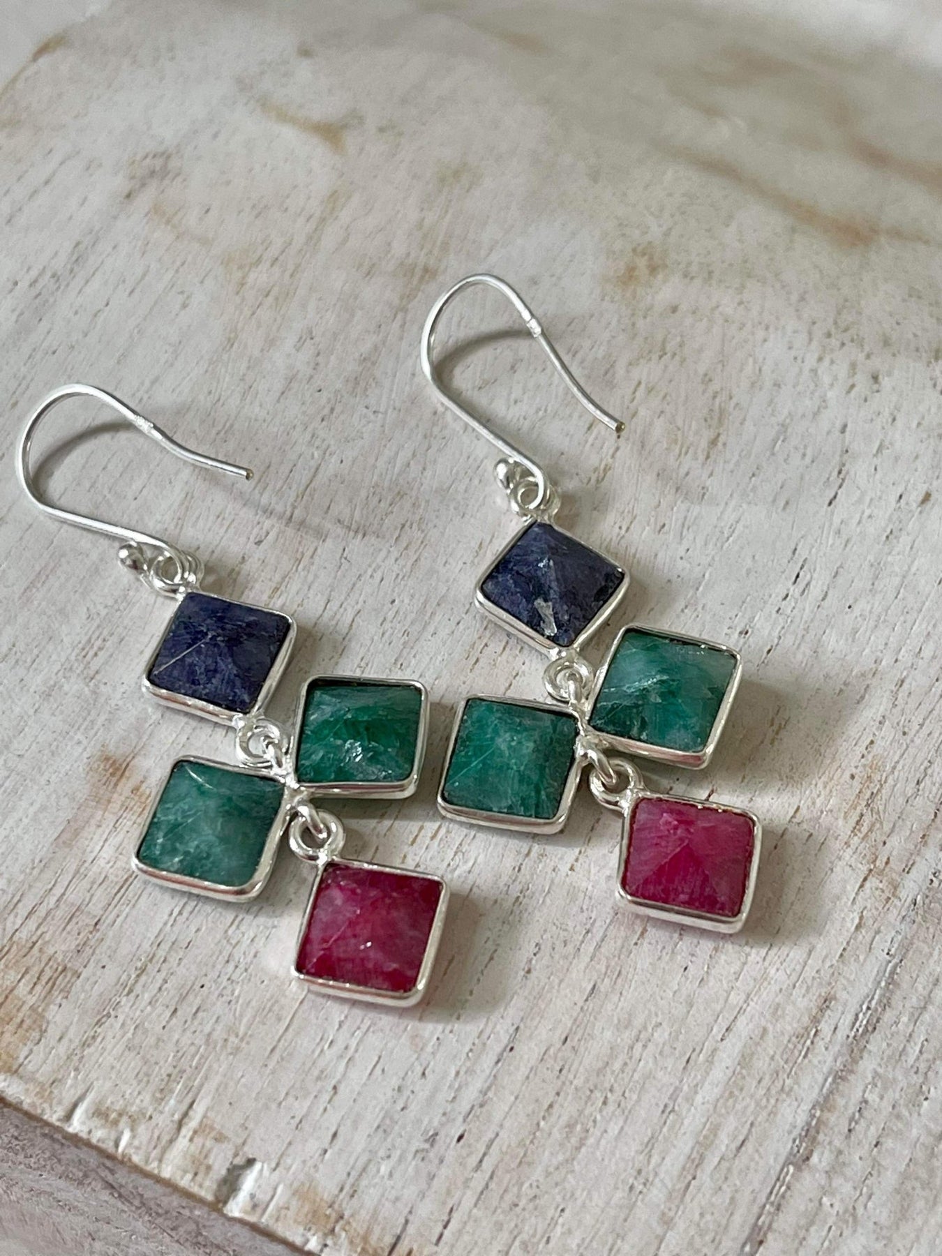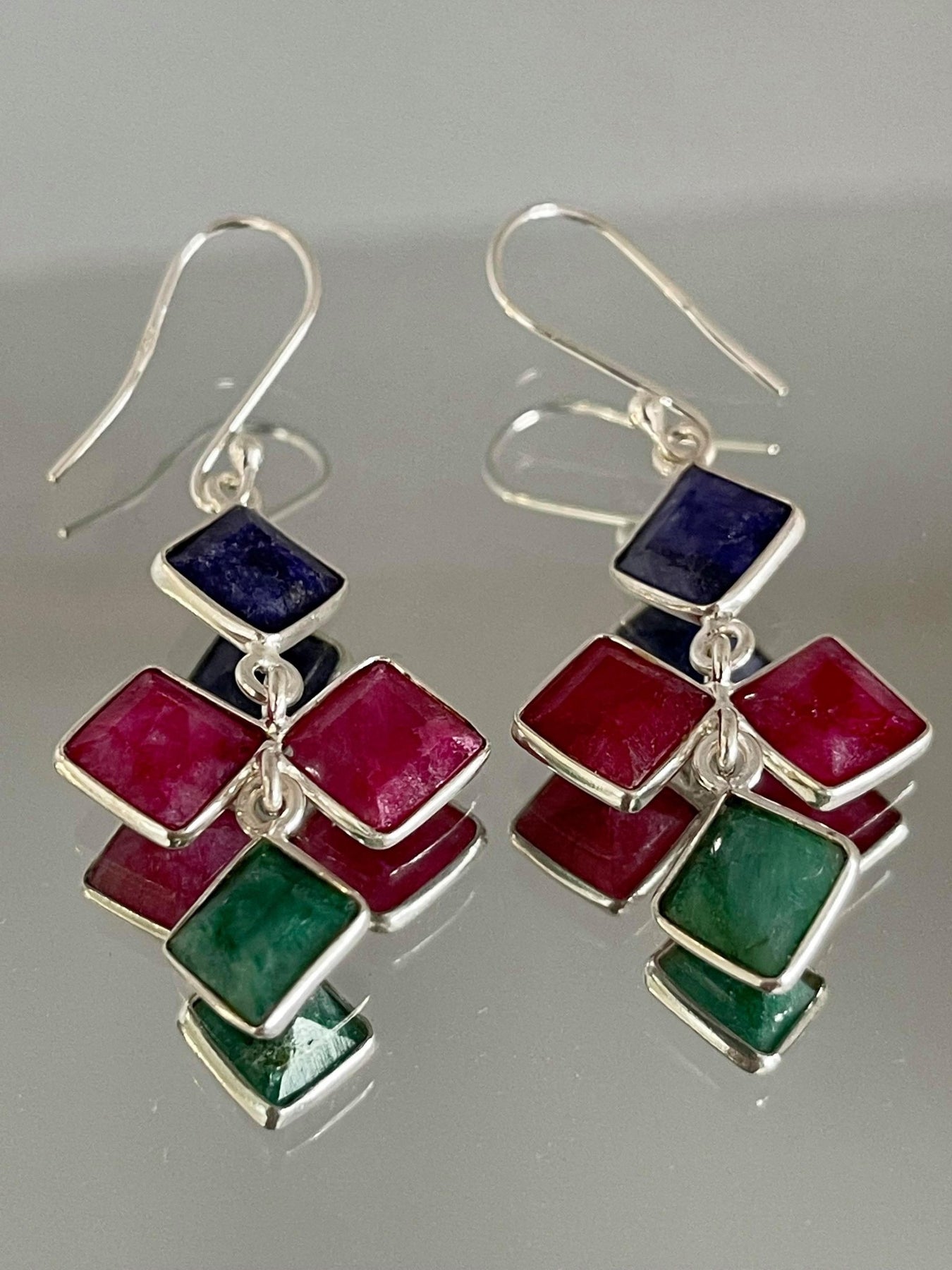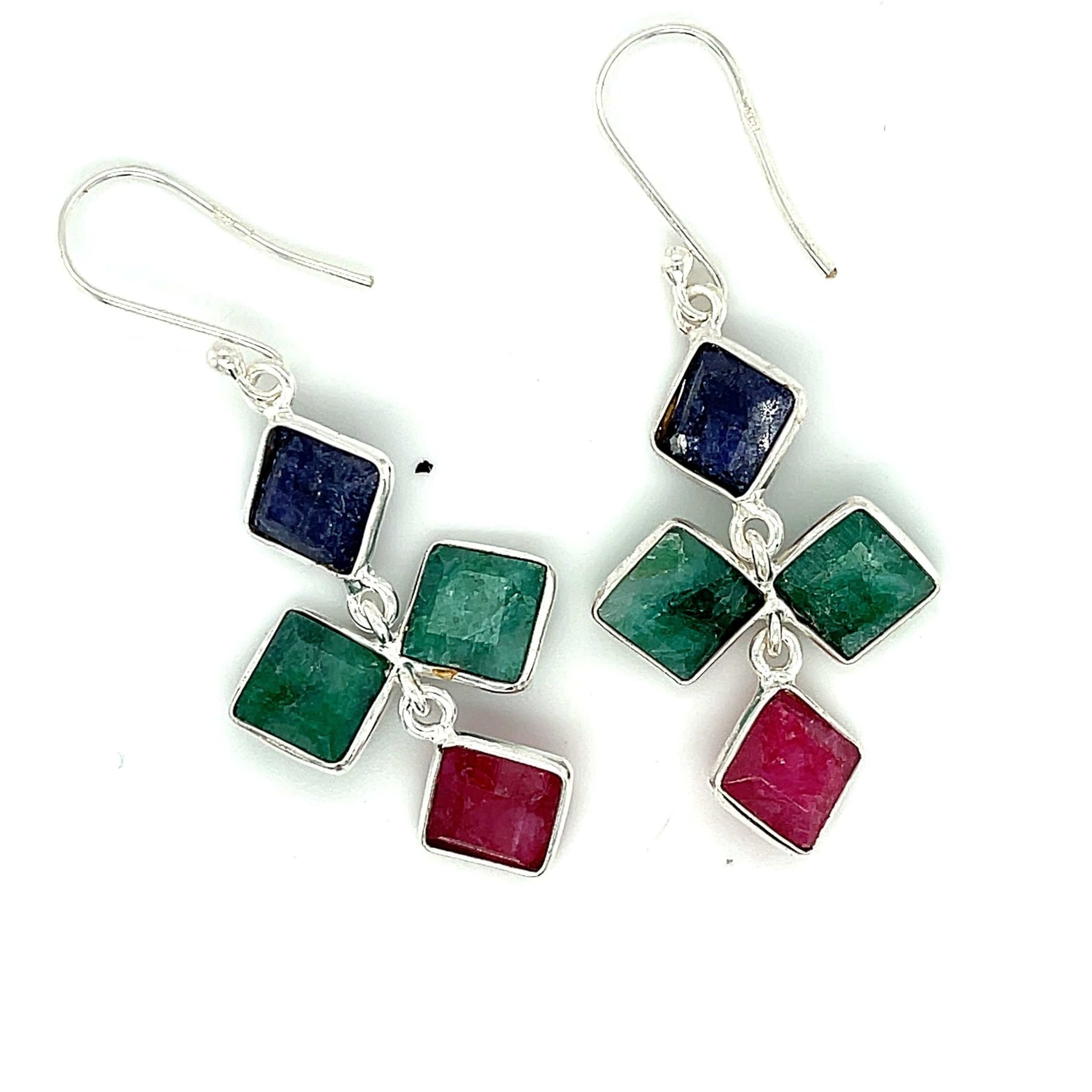 Made with sterling silver there are two square-cut ruby's, an emerald and sapphire gemstone each measuring 12 MM x 12 MM. Simple yet a standout.