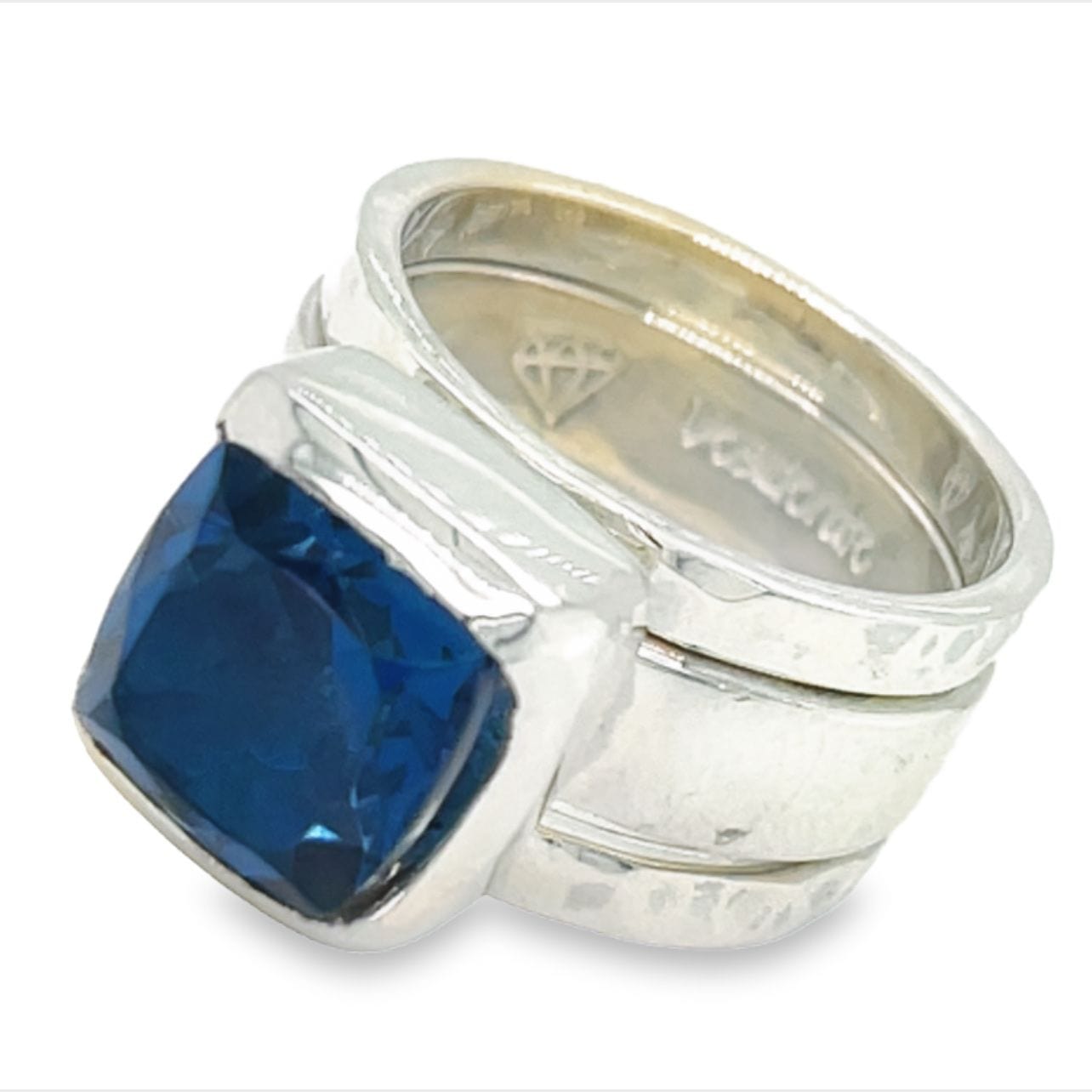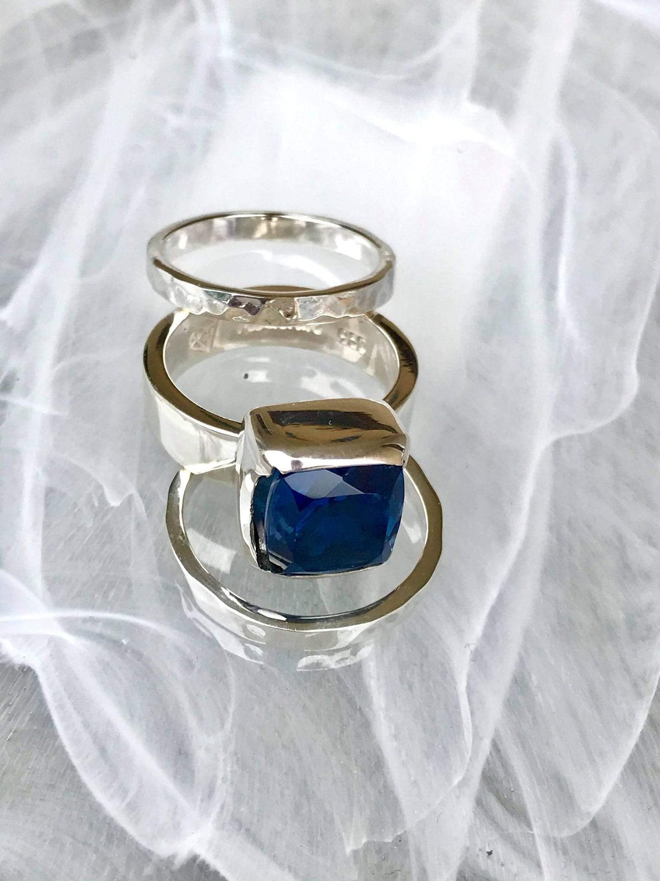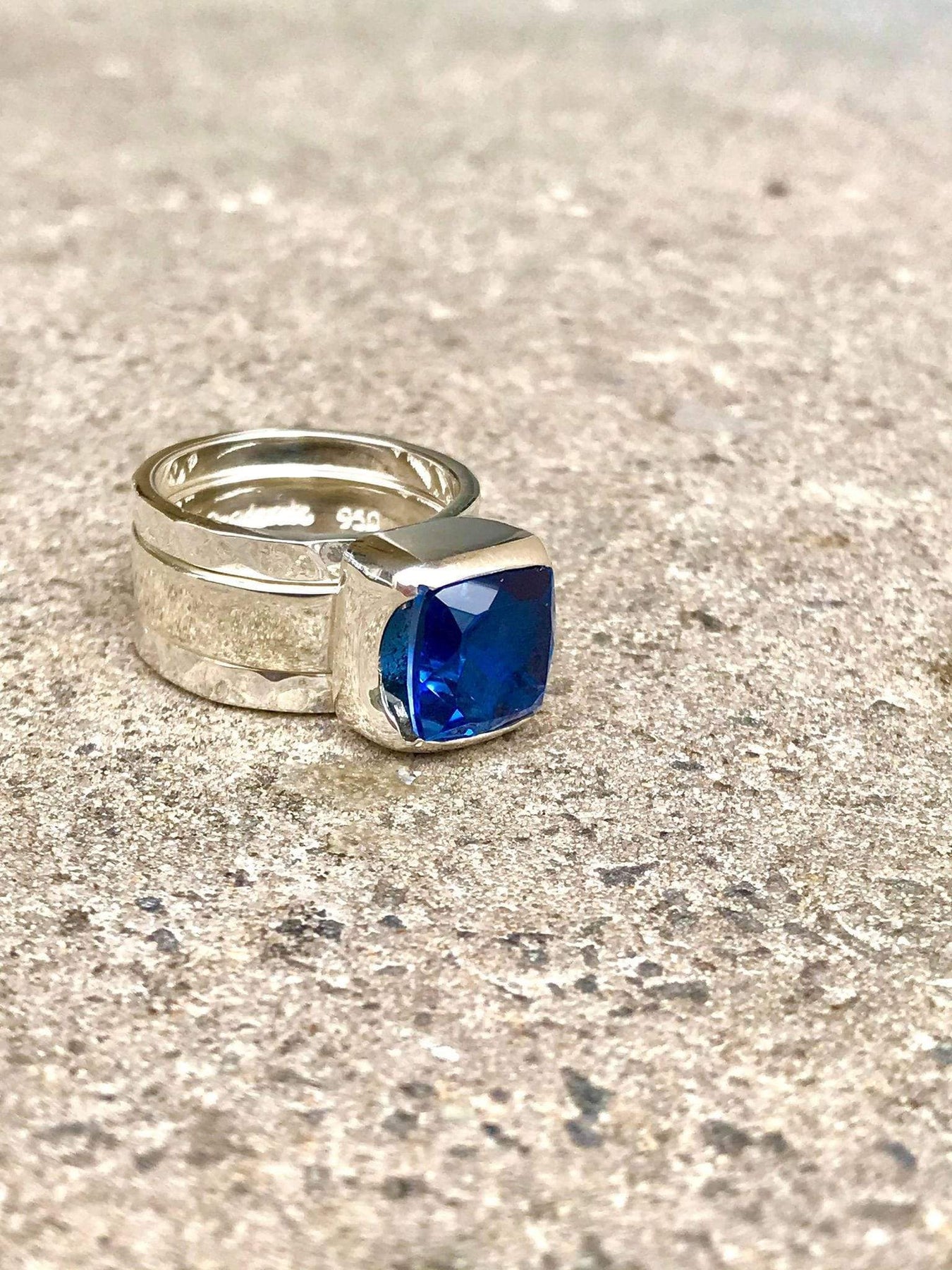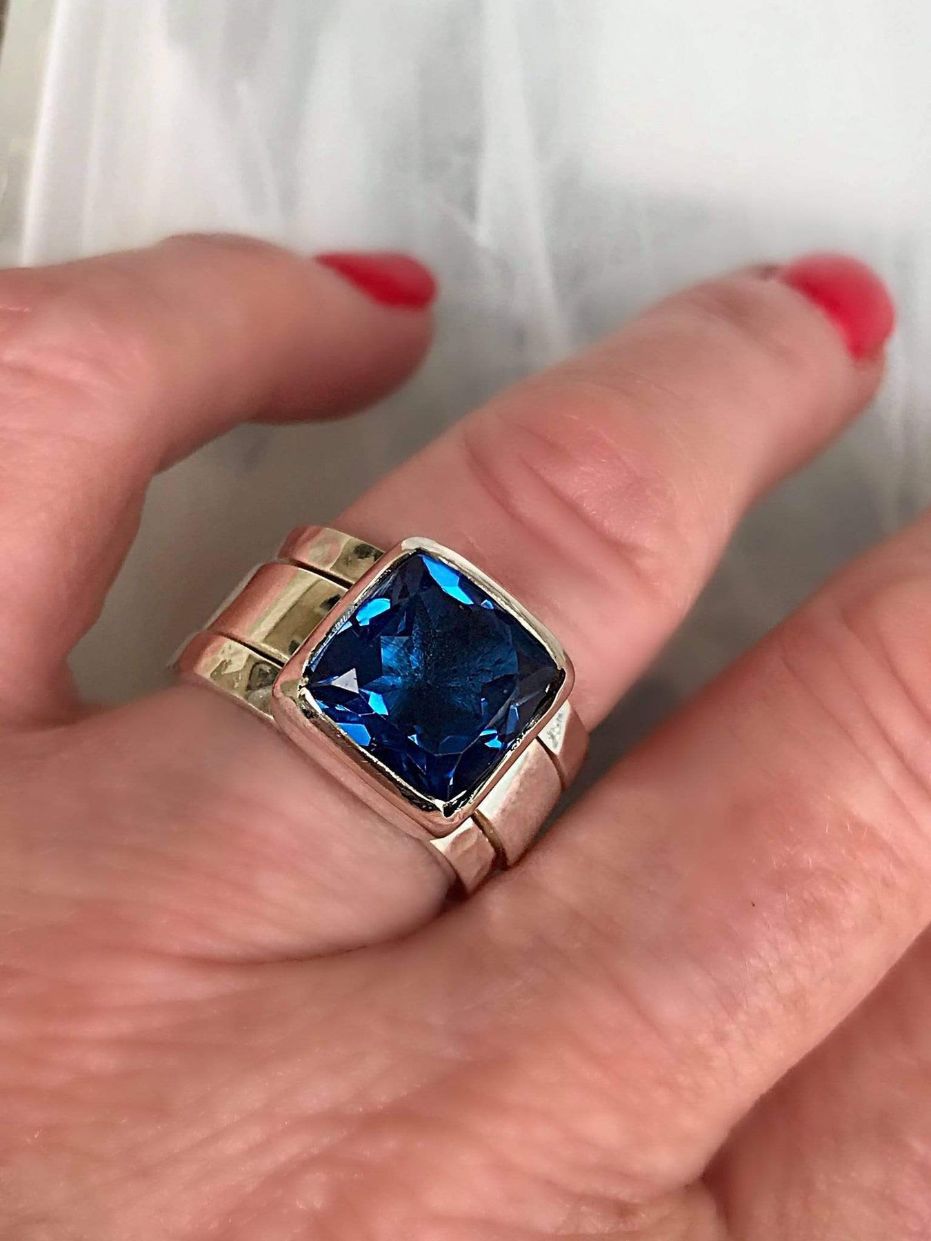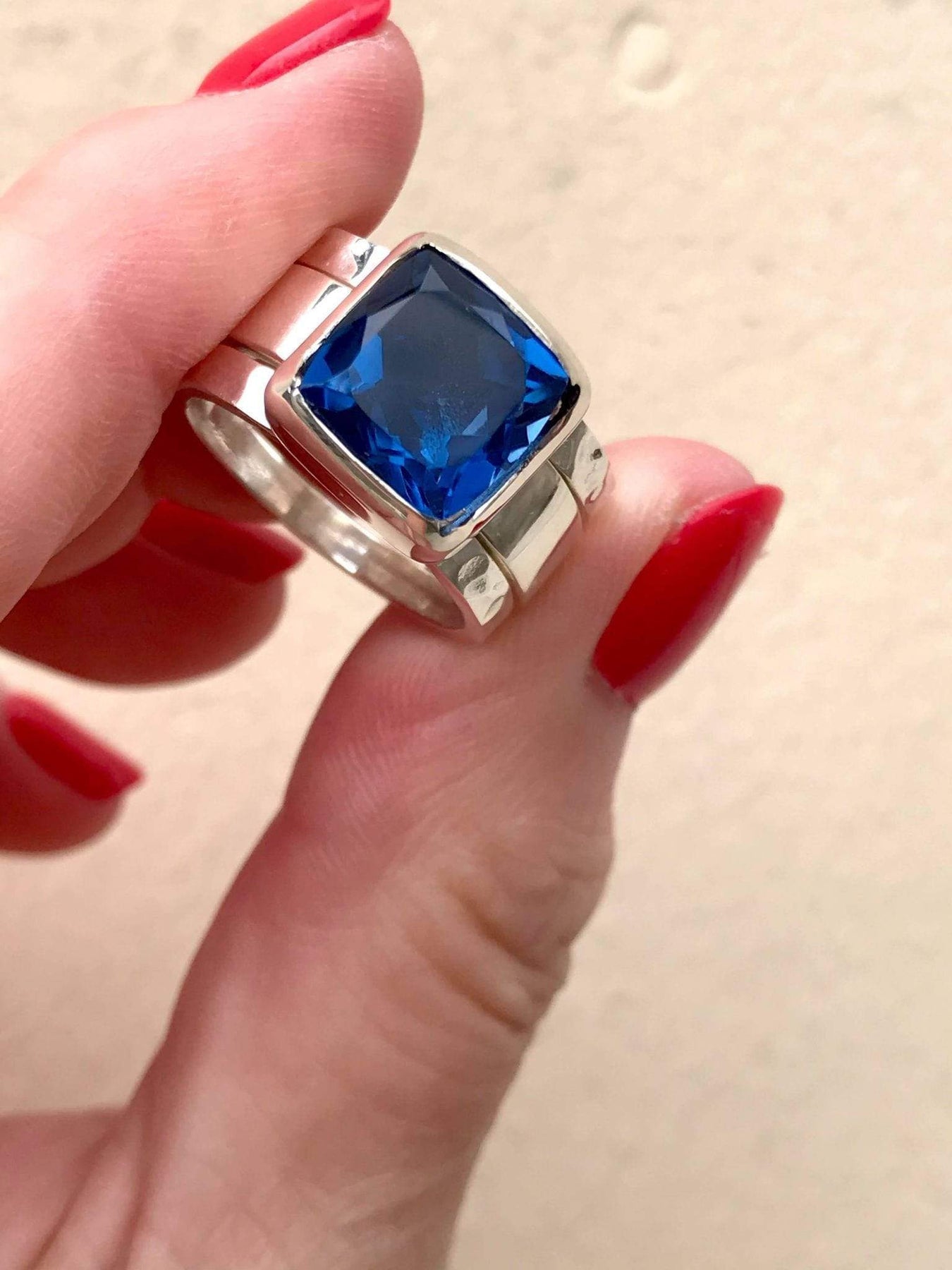I love this so much, beautiful sapphire blue, love the style and that being 3 pieces it's easy to put them on one at a time to get over my fat knuckles. I'm very happy with everything and thank you for the ring size tool.