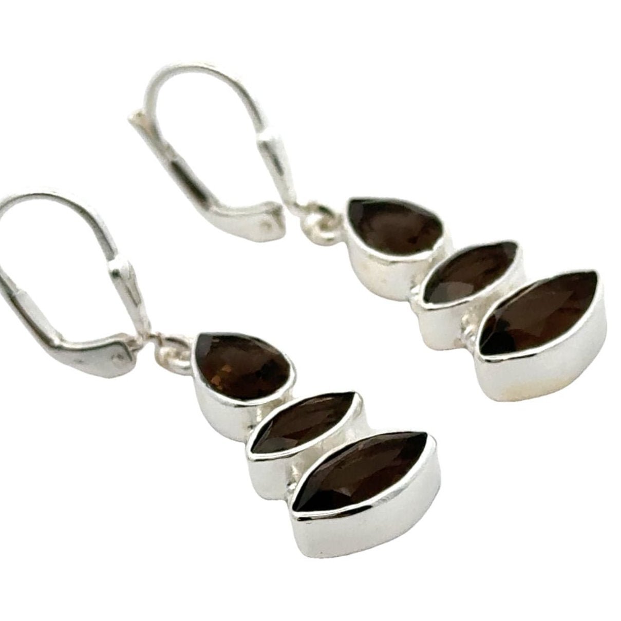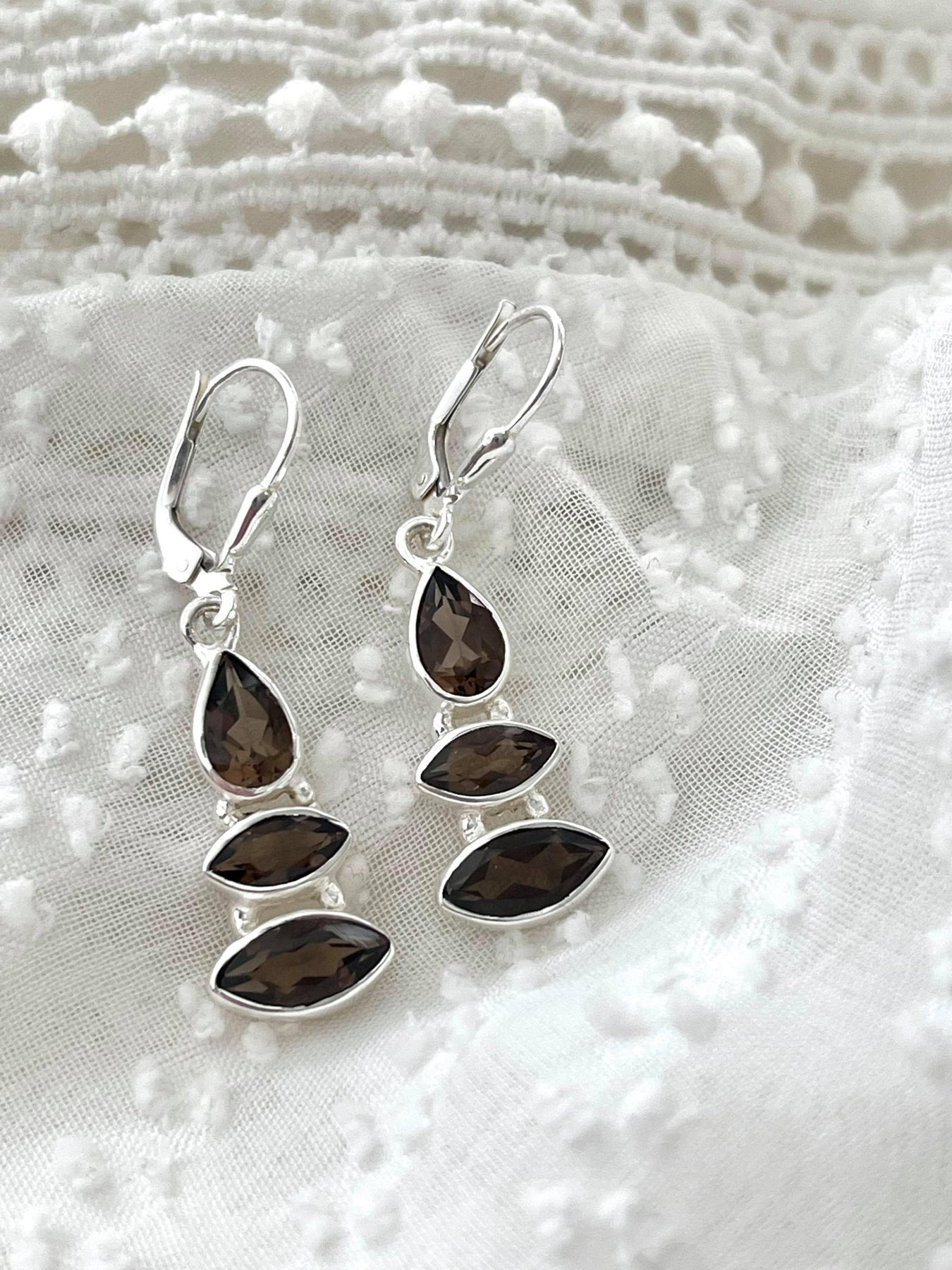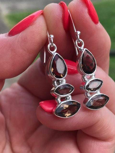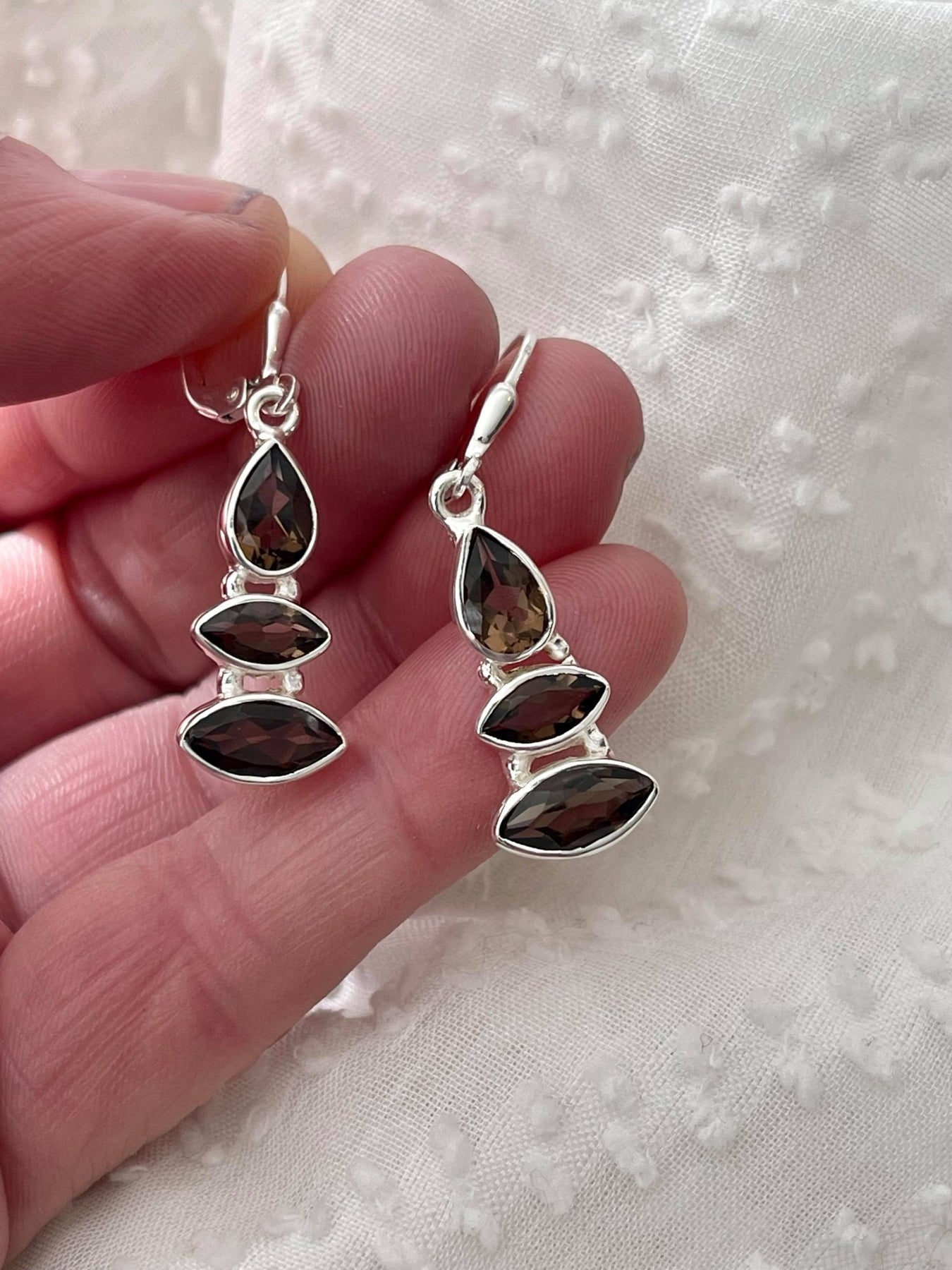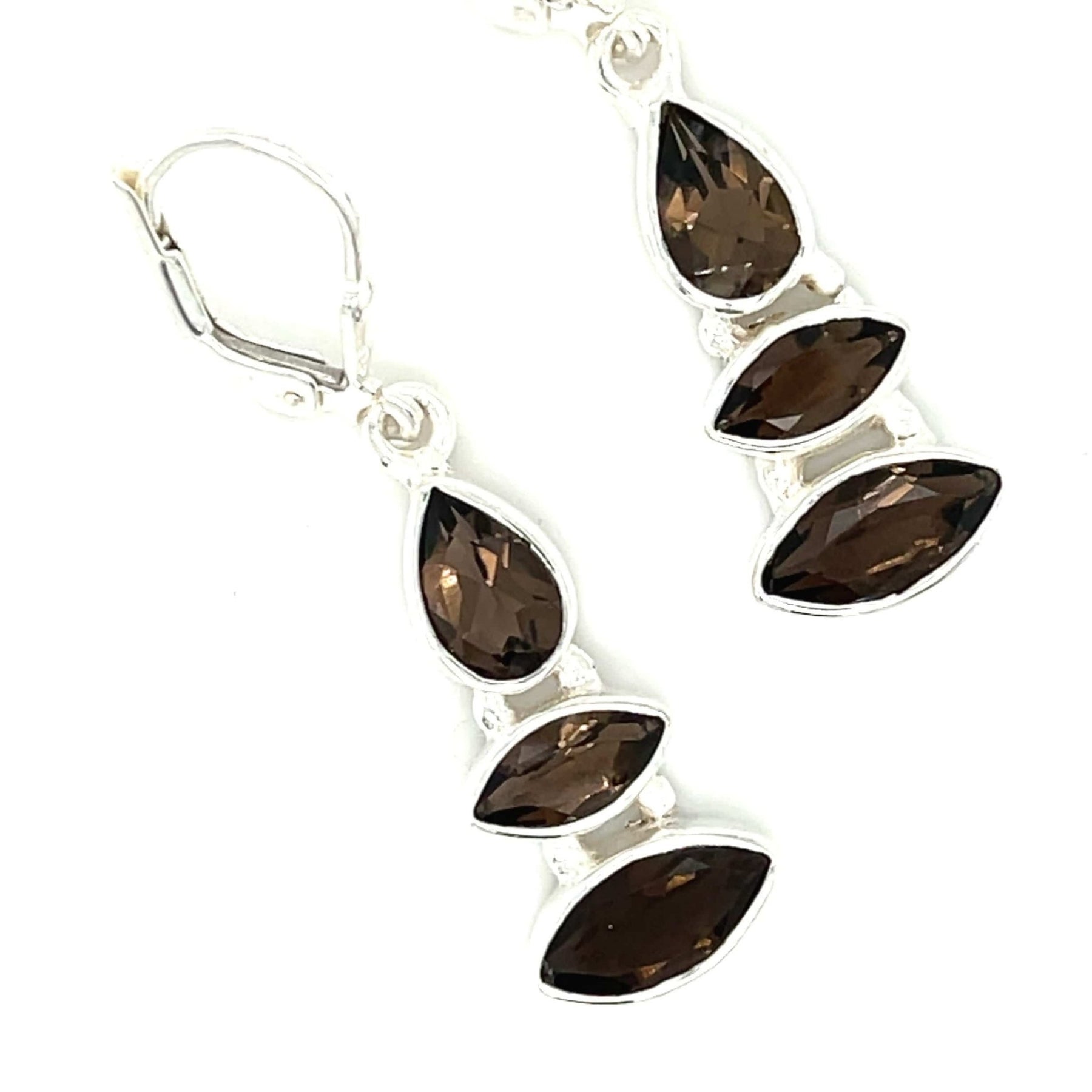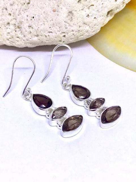 With three facet cut Smoky Quartz gems bezel set in Sterling Silver the total Drop is 40 MM from the tip of the hook.