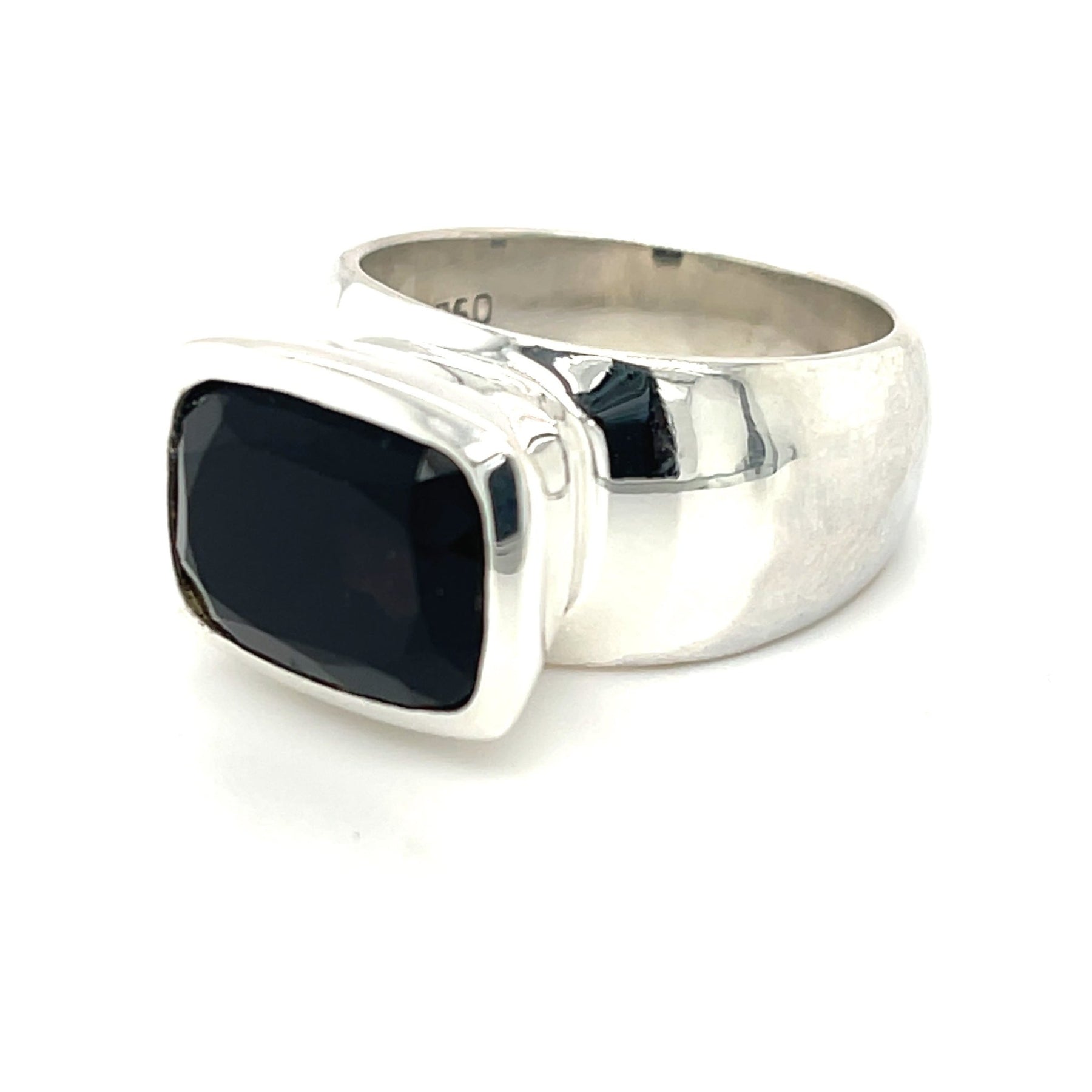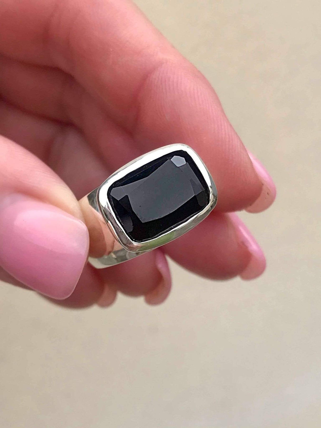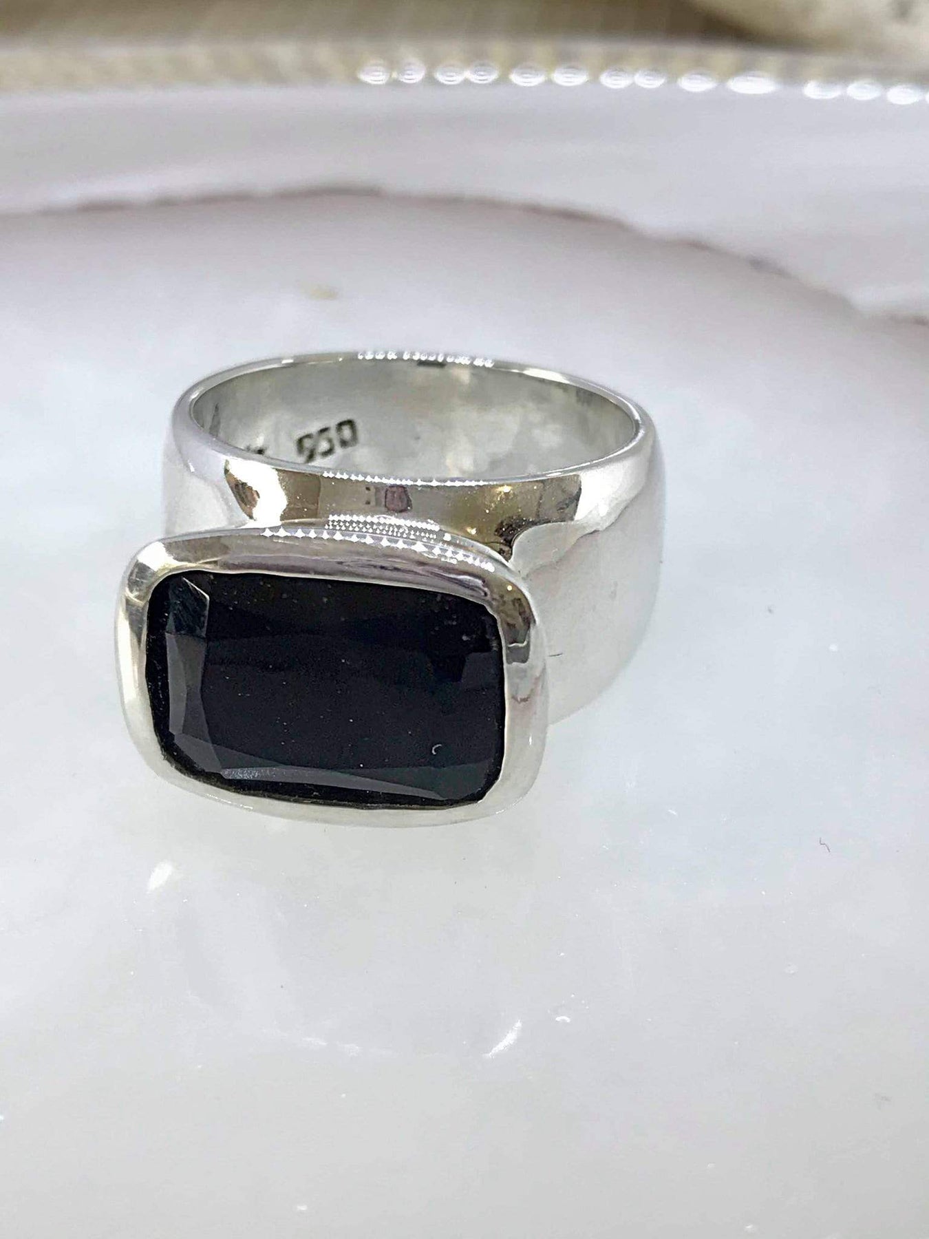 This stylish silver onyx ring is facet cut and bezel set in a solid high-quality sterling silver setting. Black and silver contrast perfectly together and the combination never dates and goes with everything.