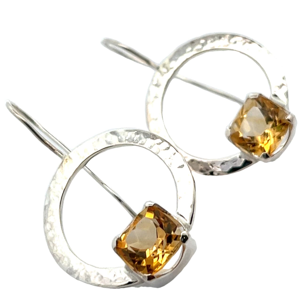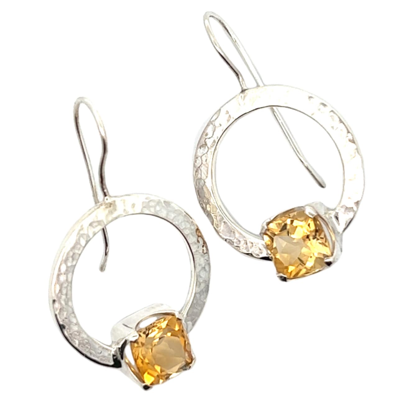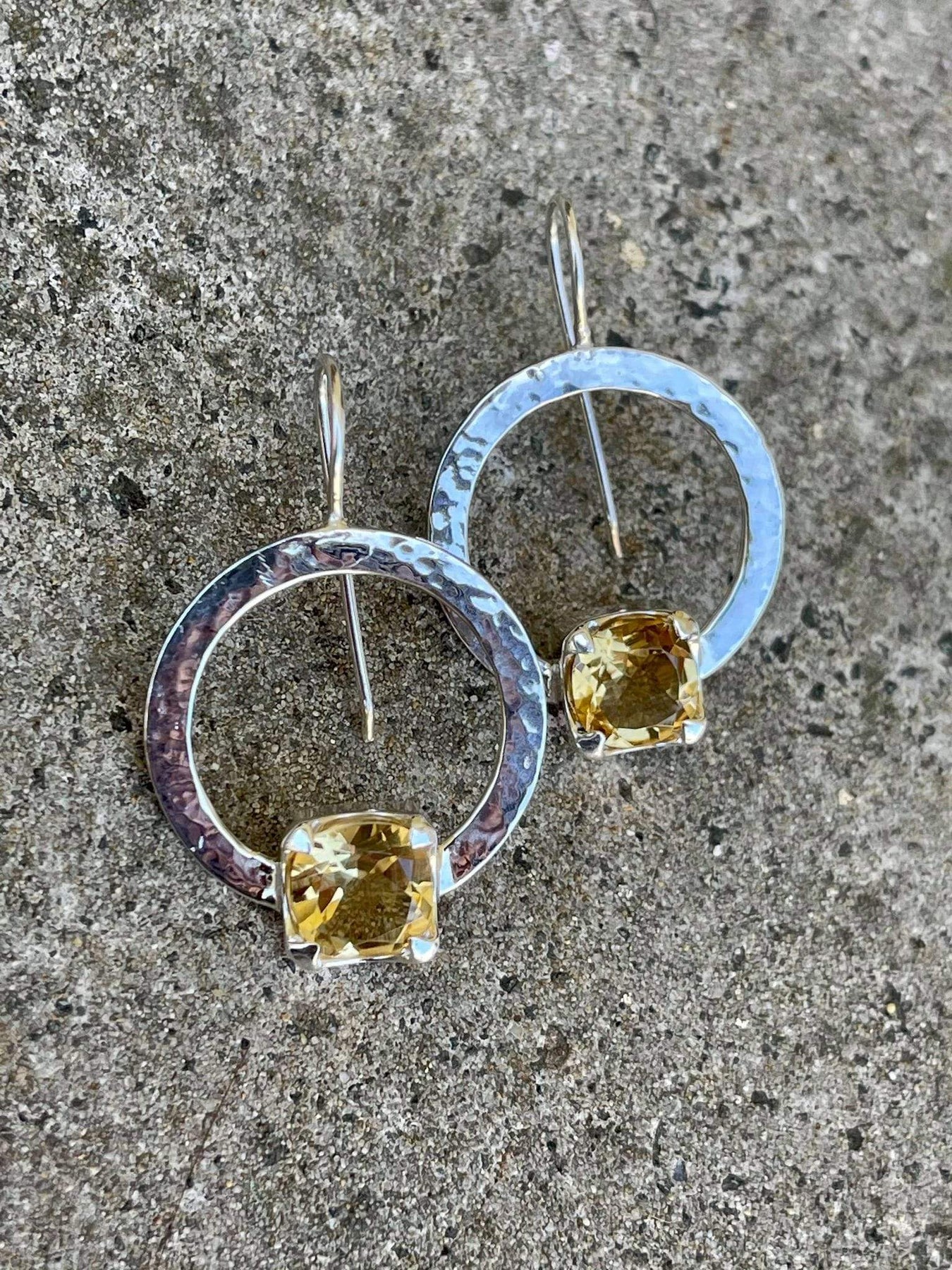 Square cut citrine sterling silver beaten hoop earrings.