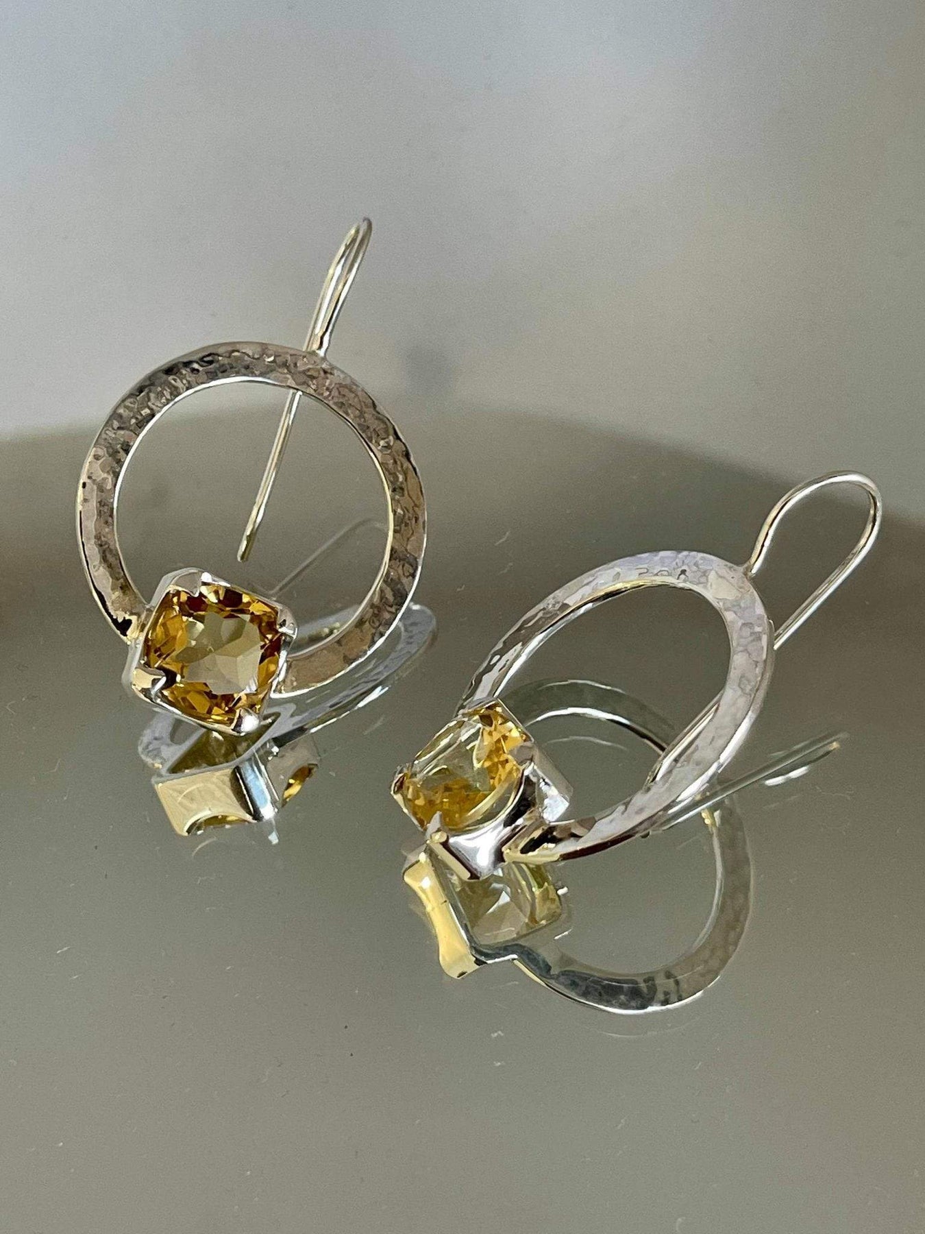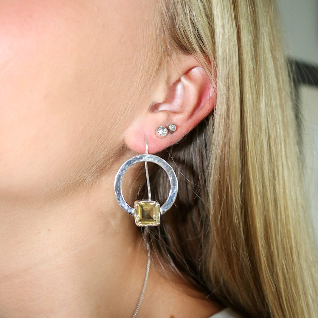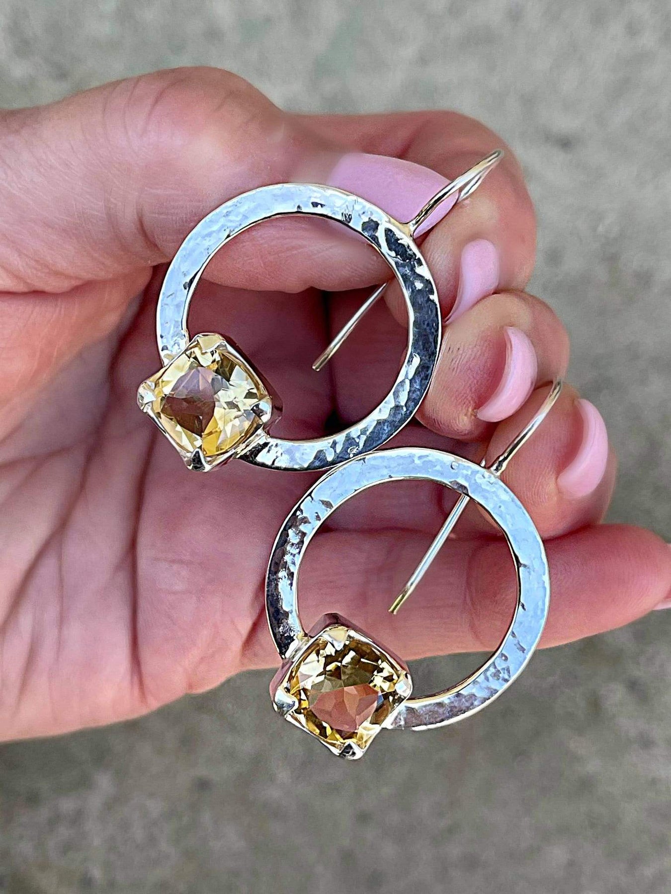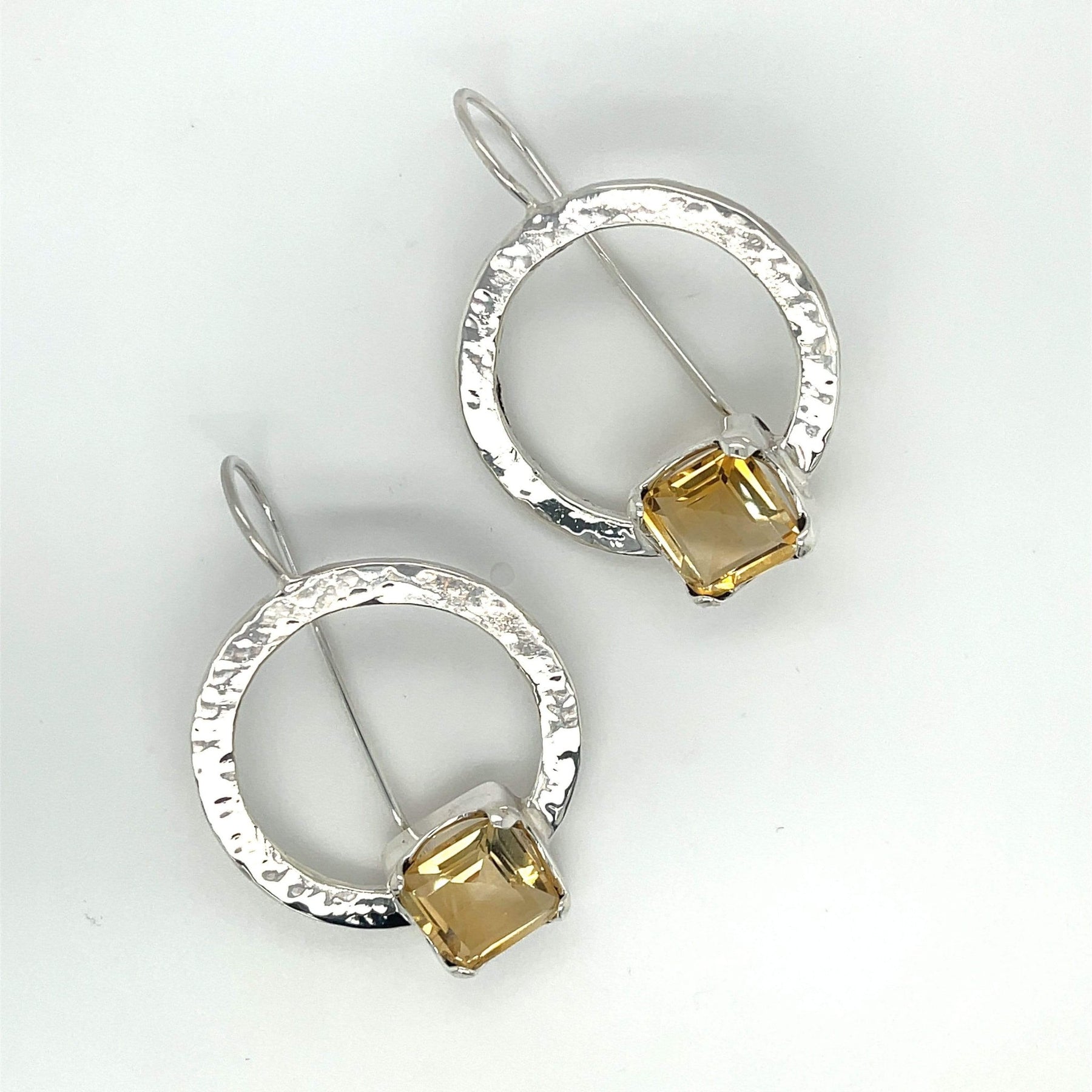 Square cut citrine sterling silver beaten hoop earrings.