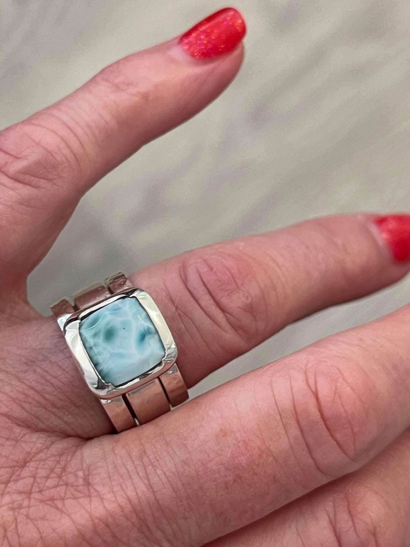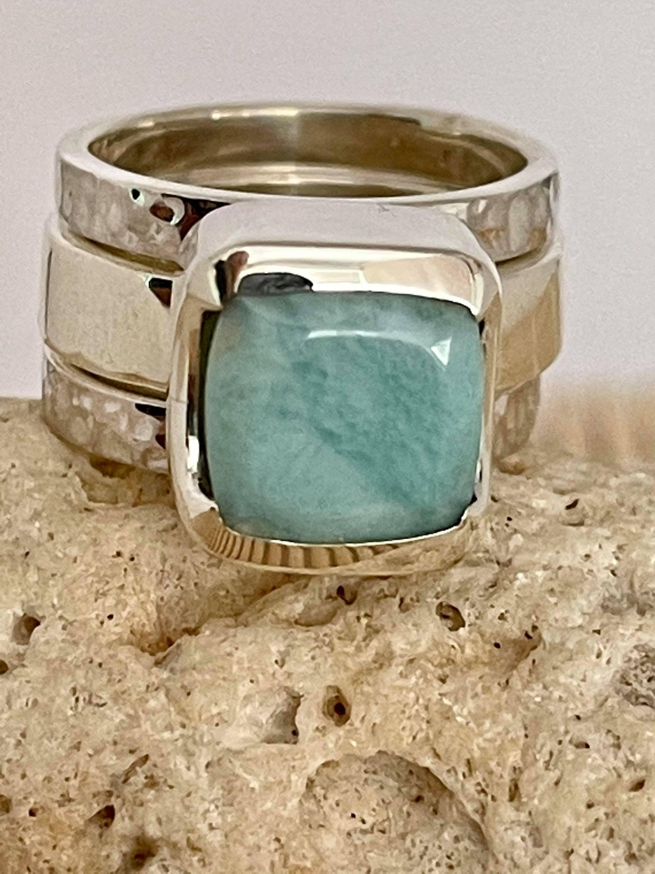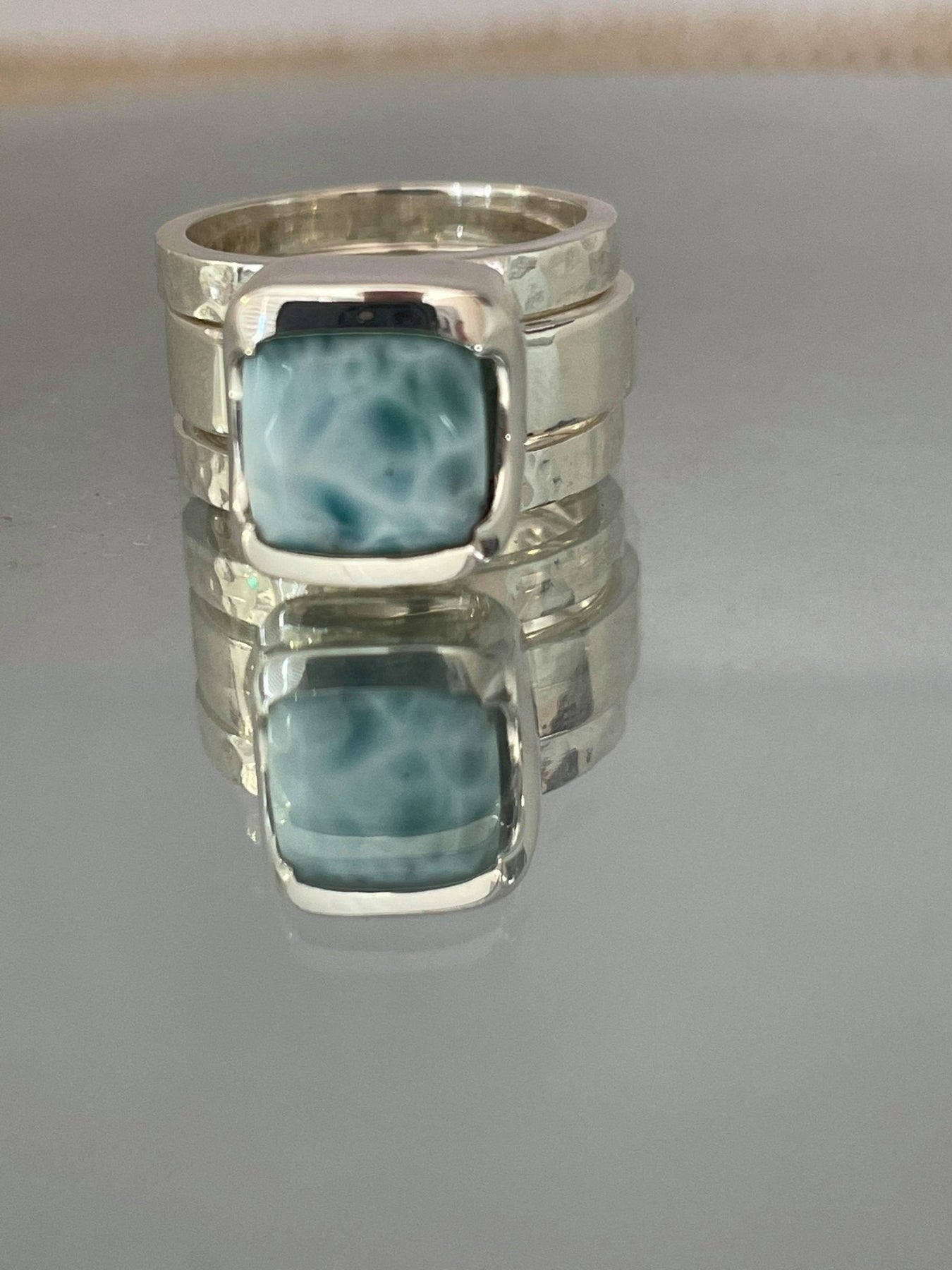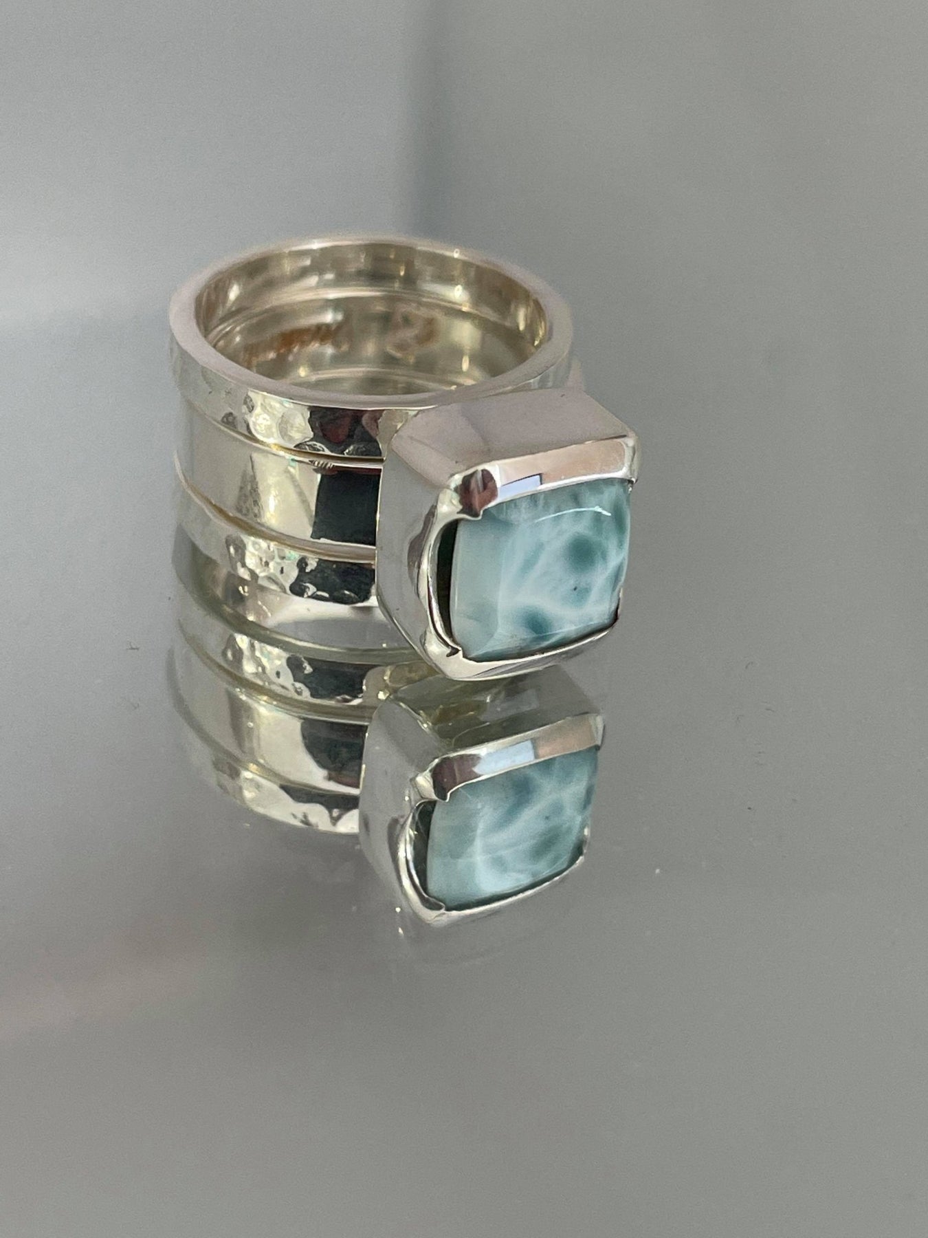 I'm so happy with this stunning set of rings. The craftmenship if exceptional, the larimar is beautiful, I love the unusual design and now have ordered the matching necklace and earrings. Simply outstanding.