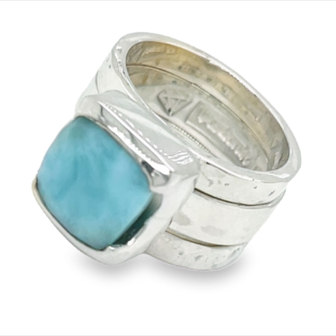 The square-cut Larimar ring exudes positivity, calmness and evokes a sense of healing when worn. These stones have a magical cloudy sky blue colour that makes you feel you are on cloud nine when wearing them.