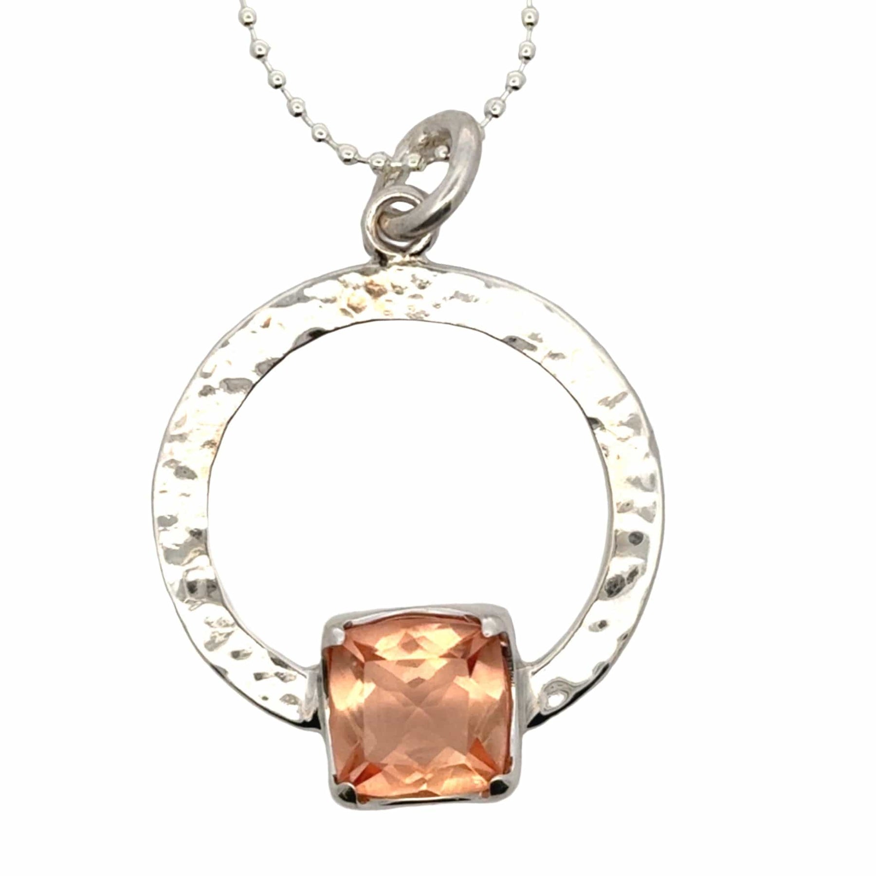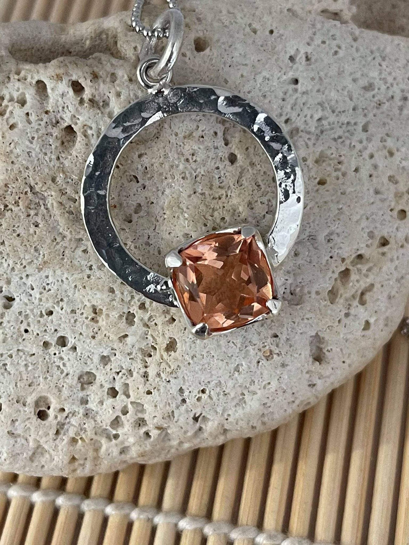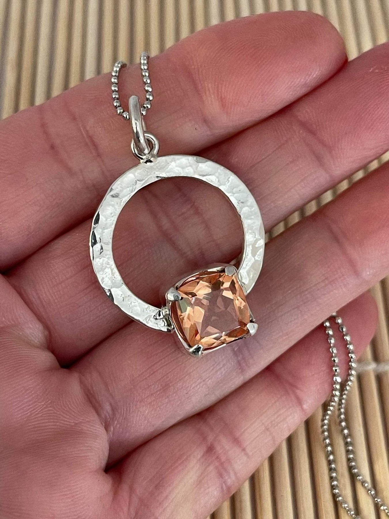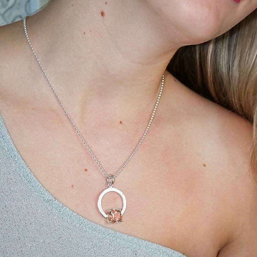 If you have a bit of a quirky streak when it comes to taste in jewellery, well not super quirky, you just like to be unique and have an original design, that you won't see everywhere... Then this morganite quartz pendant in beaten silver has your name all over it!
