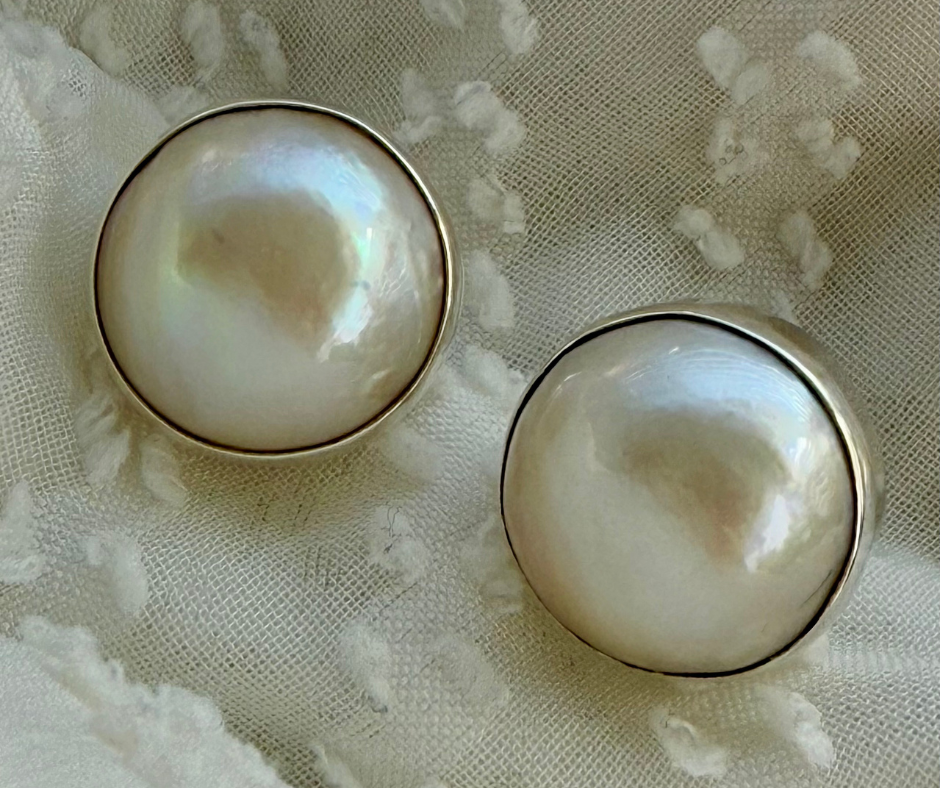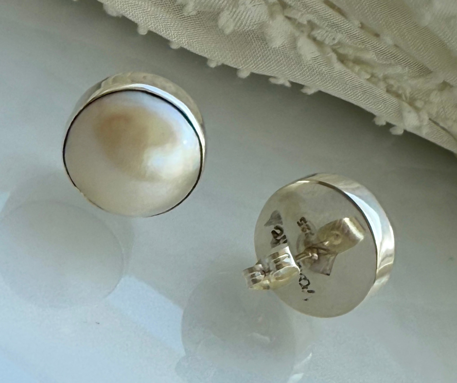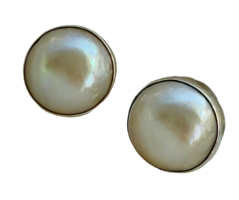 They are a larger size at approximately 16 MM diameter than most pearl studs and set in a shiny Sterling Silver Bezel setting.