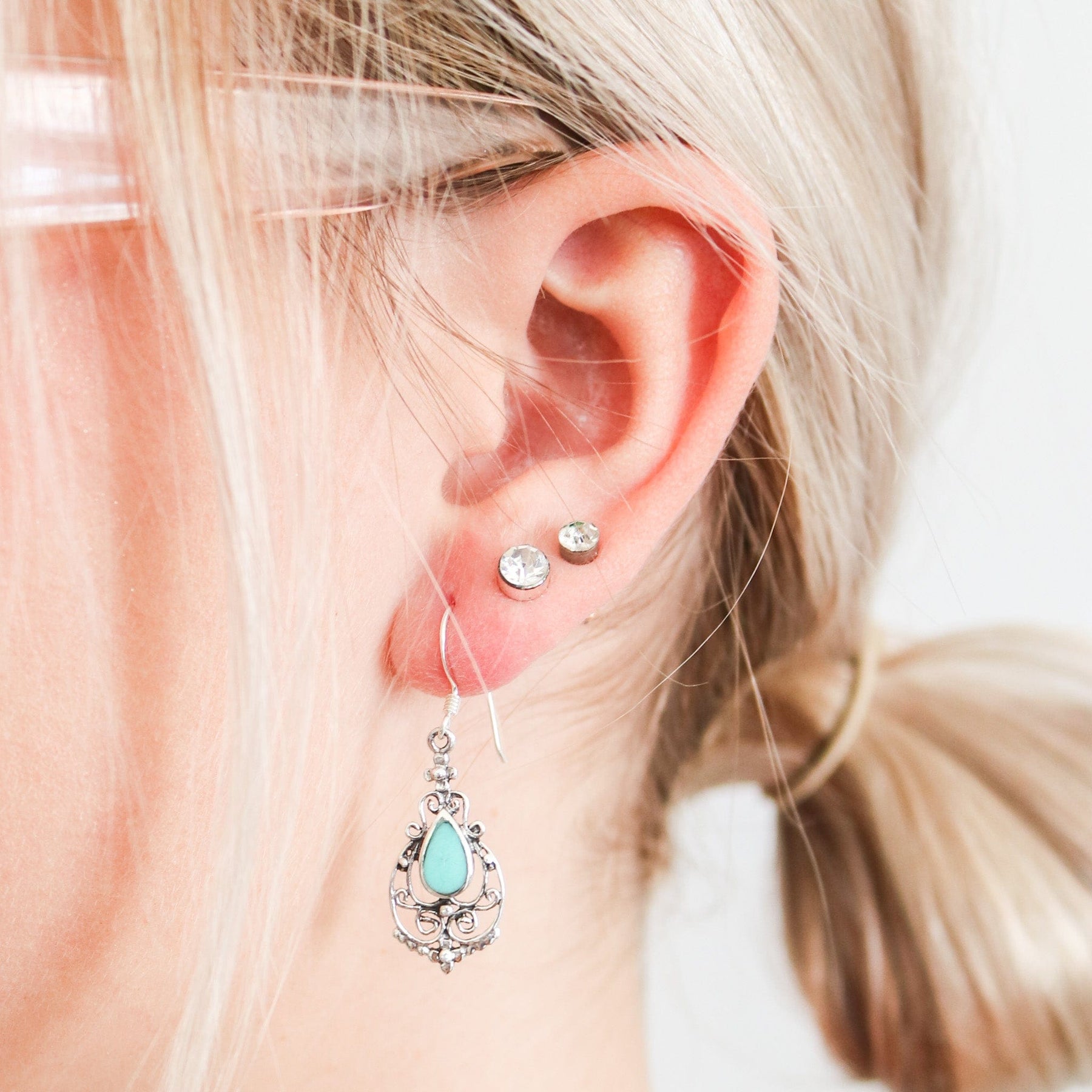 Wearing these earrings is like adorning yourself with a piece of tranquility. The turquoise colour is believed to balance chakras, providing a sense of calm and aligning mood swings. The teardrop shapes symbolise the end of tears and the beginning of happiness, infusing a positive energy that you can carry throughout your day.