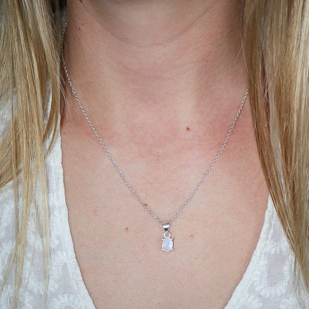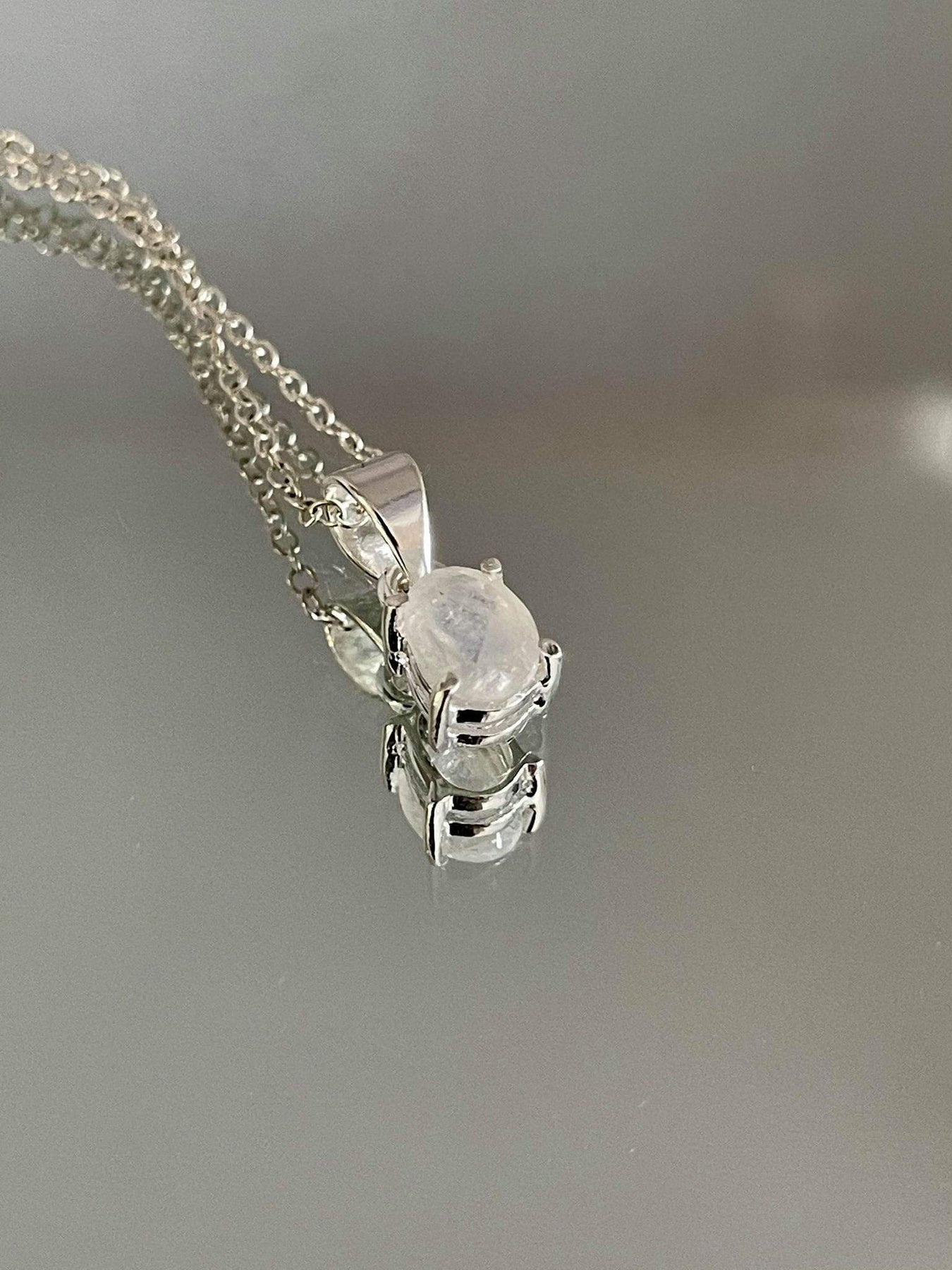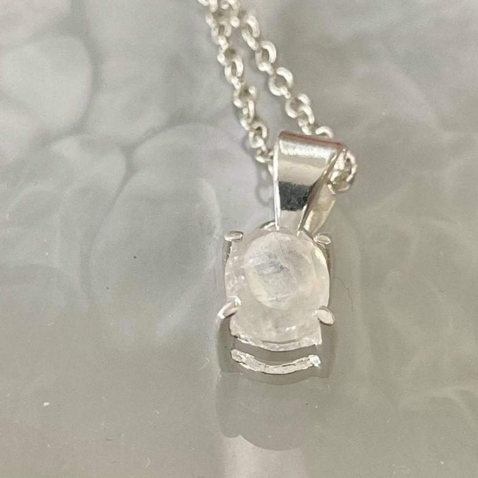 The 7 x 5 MM moonstone is the birthstone for June and comes with a complimentary chain.
