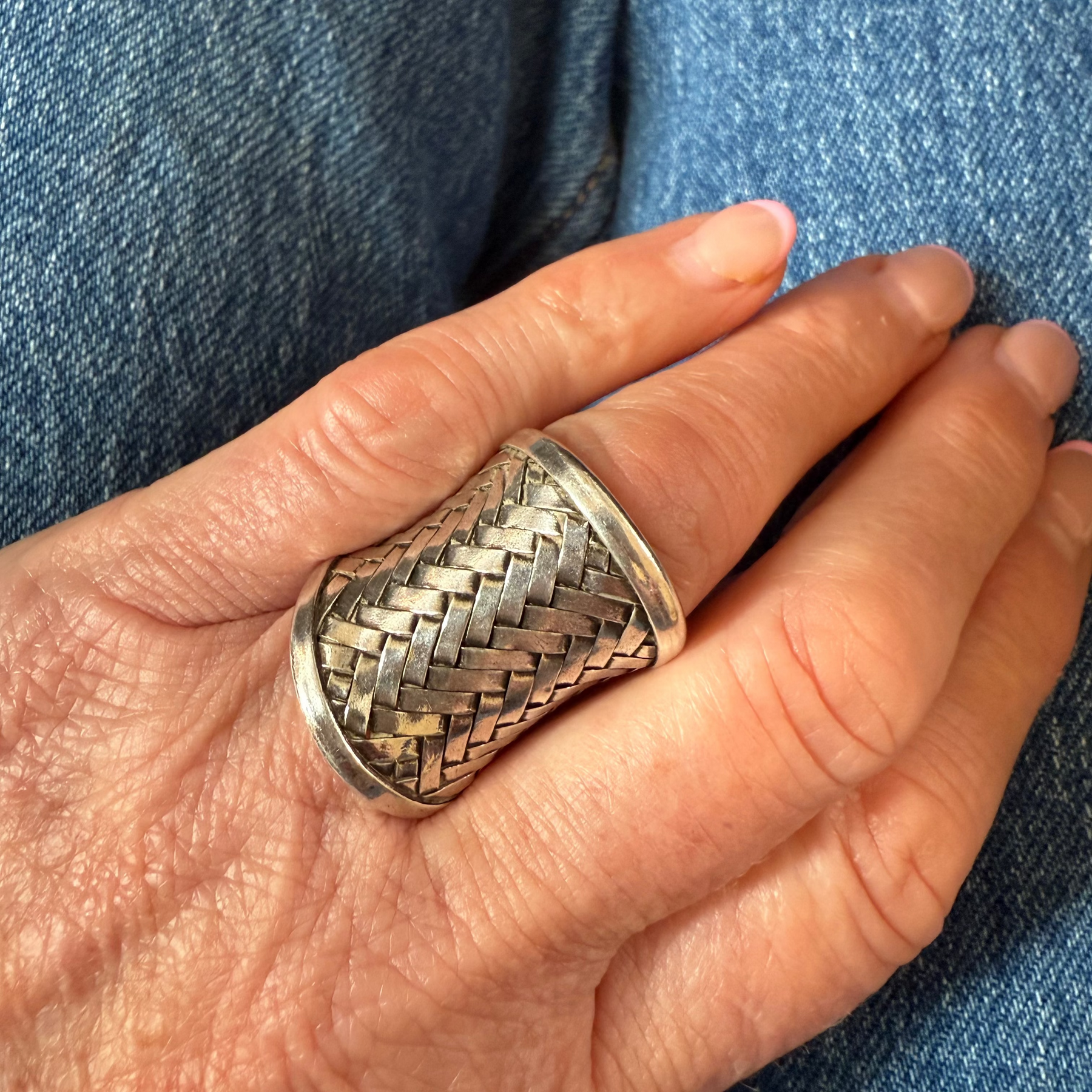 Hand wearing a silver woven ring against a blue denim background