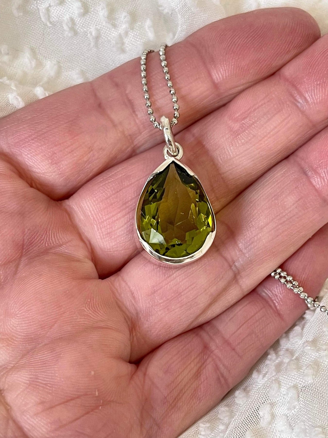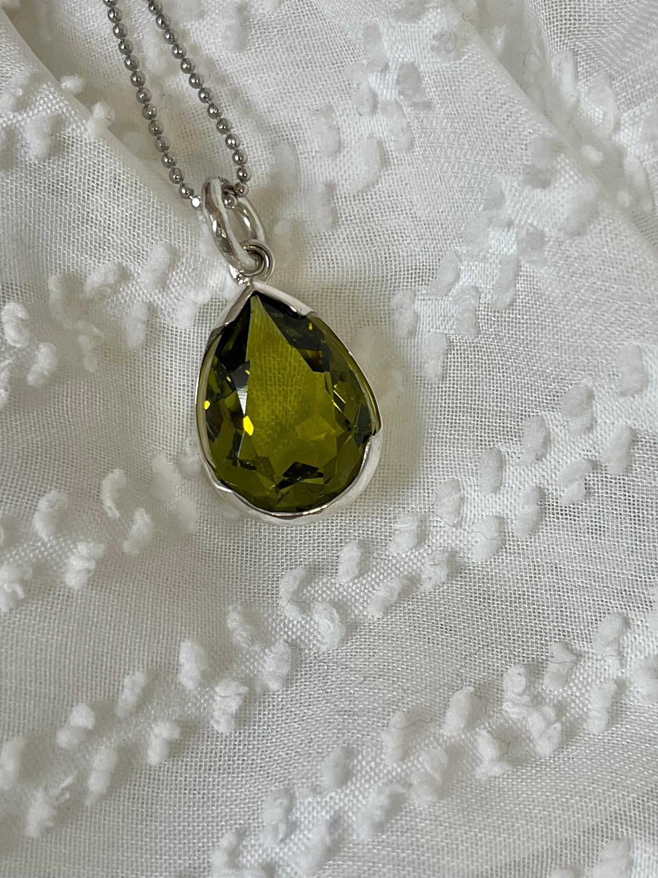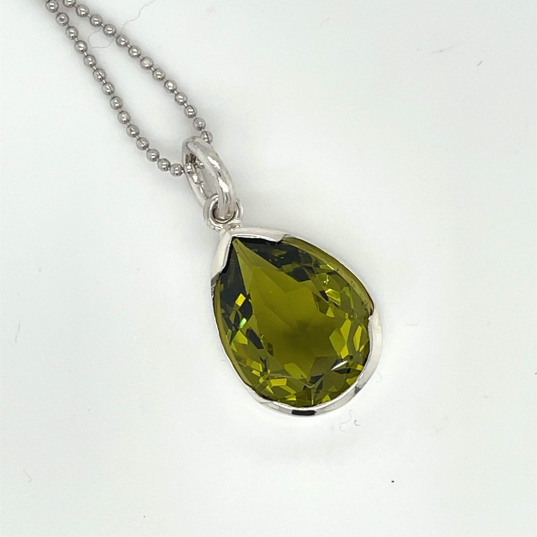 High-quality teardrop cut Peridot in a simple Sterling Silver setting to showcase the gem's absolute beauty.