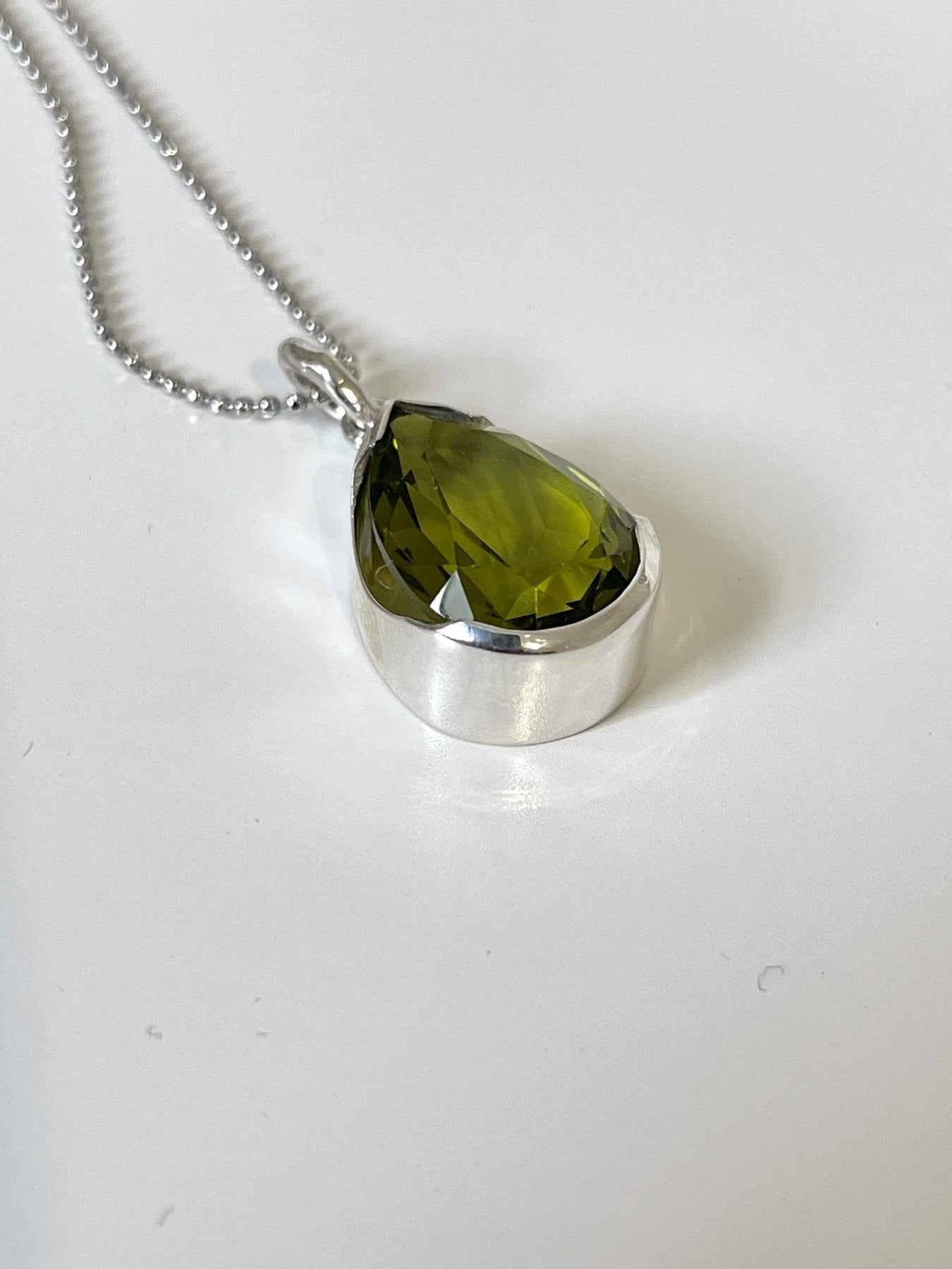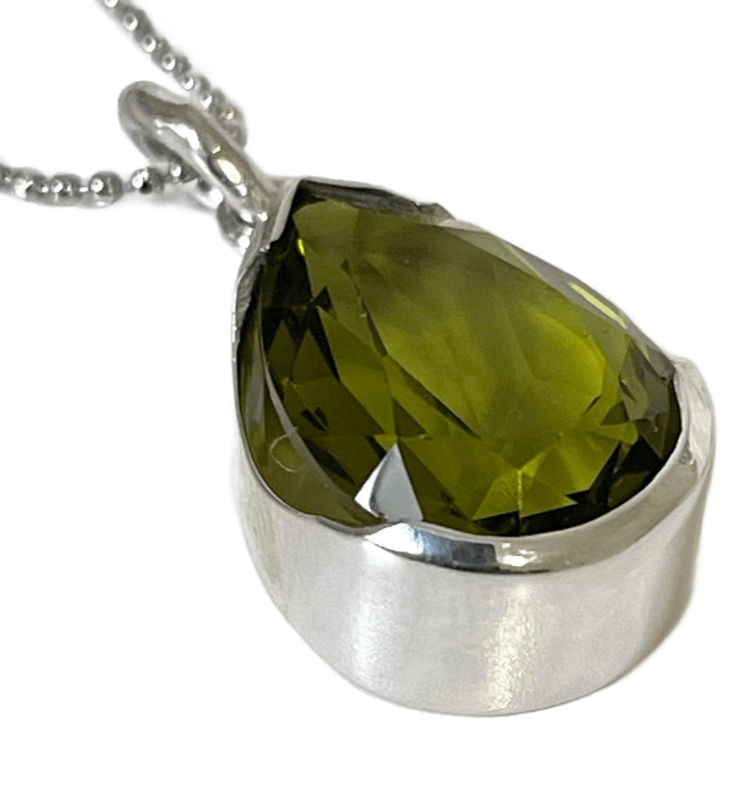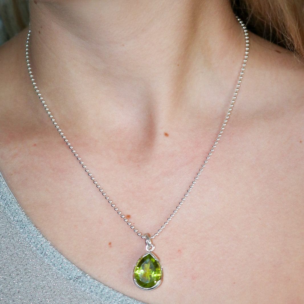 High-quality teardrop cut Peridot in a simple Sterling Silver setting to showcase the gem's absolute beauty.
