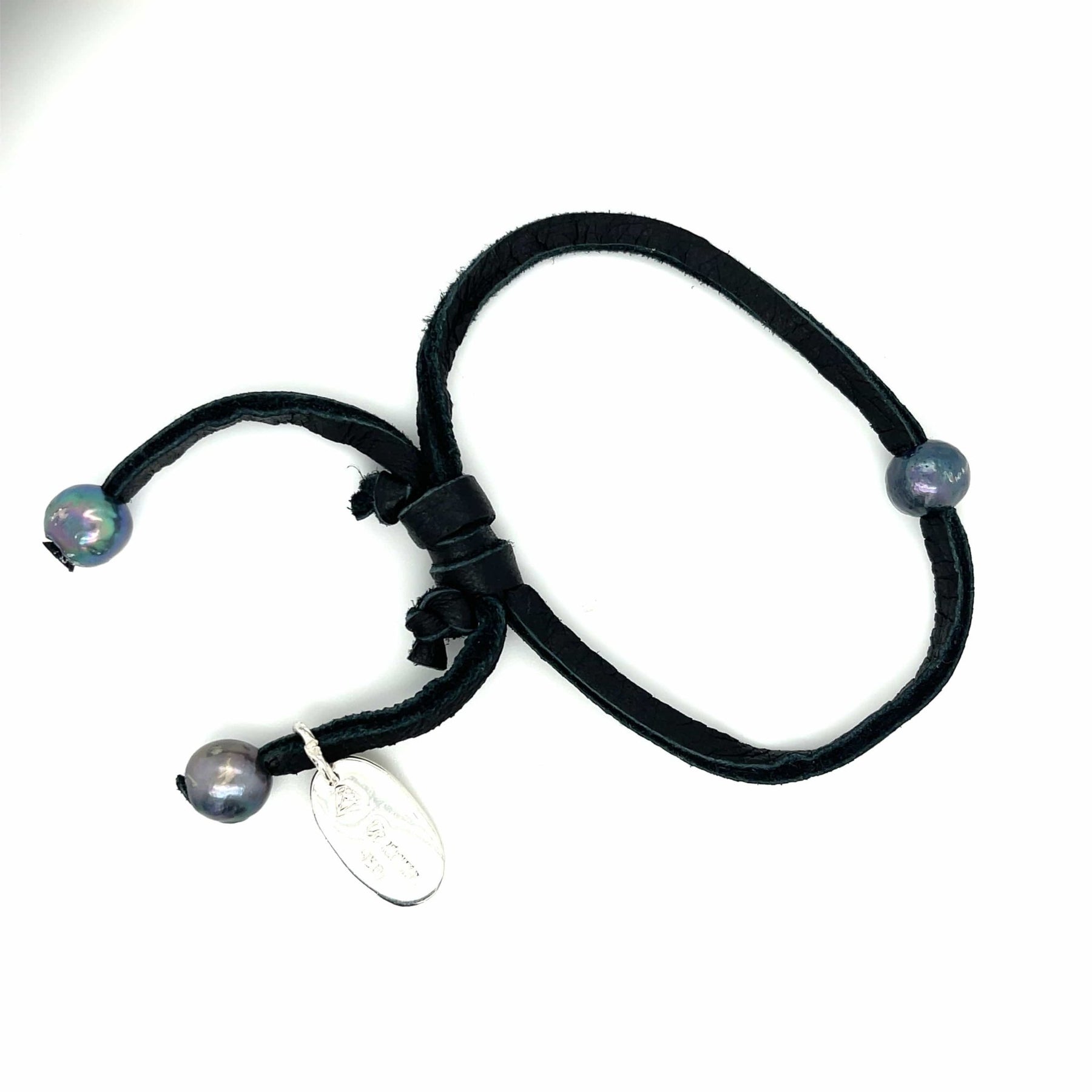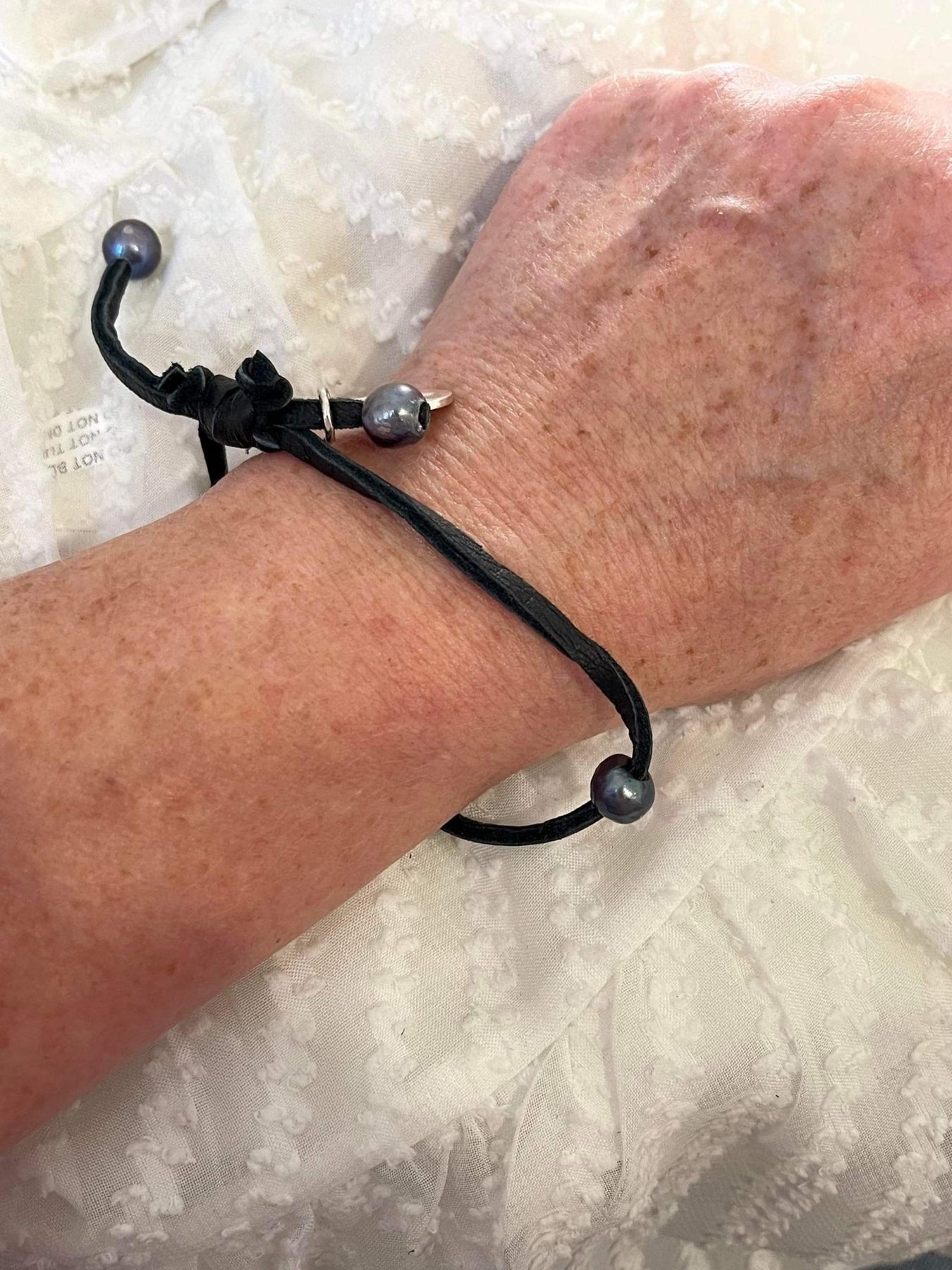 These fabulous Tahitian black pearl leather strap bracelets are extremely versatile in sizing and take the one size fits all to another level. Whether your wrist is teeny tiny or a bit more broad rest assured, this will look fabulous!