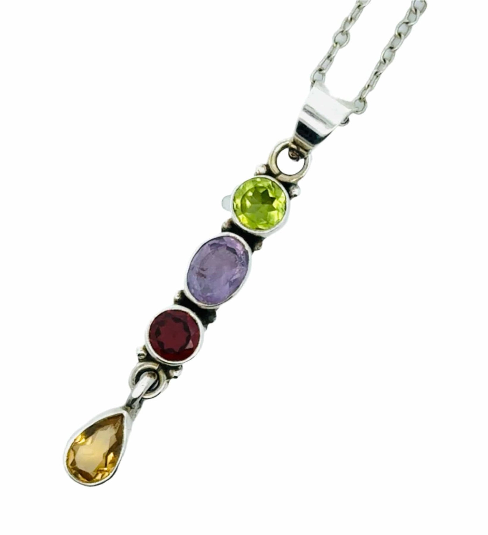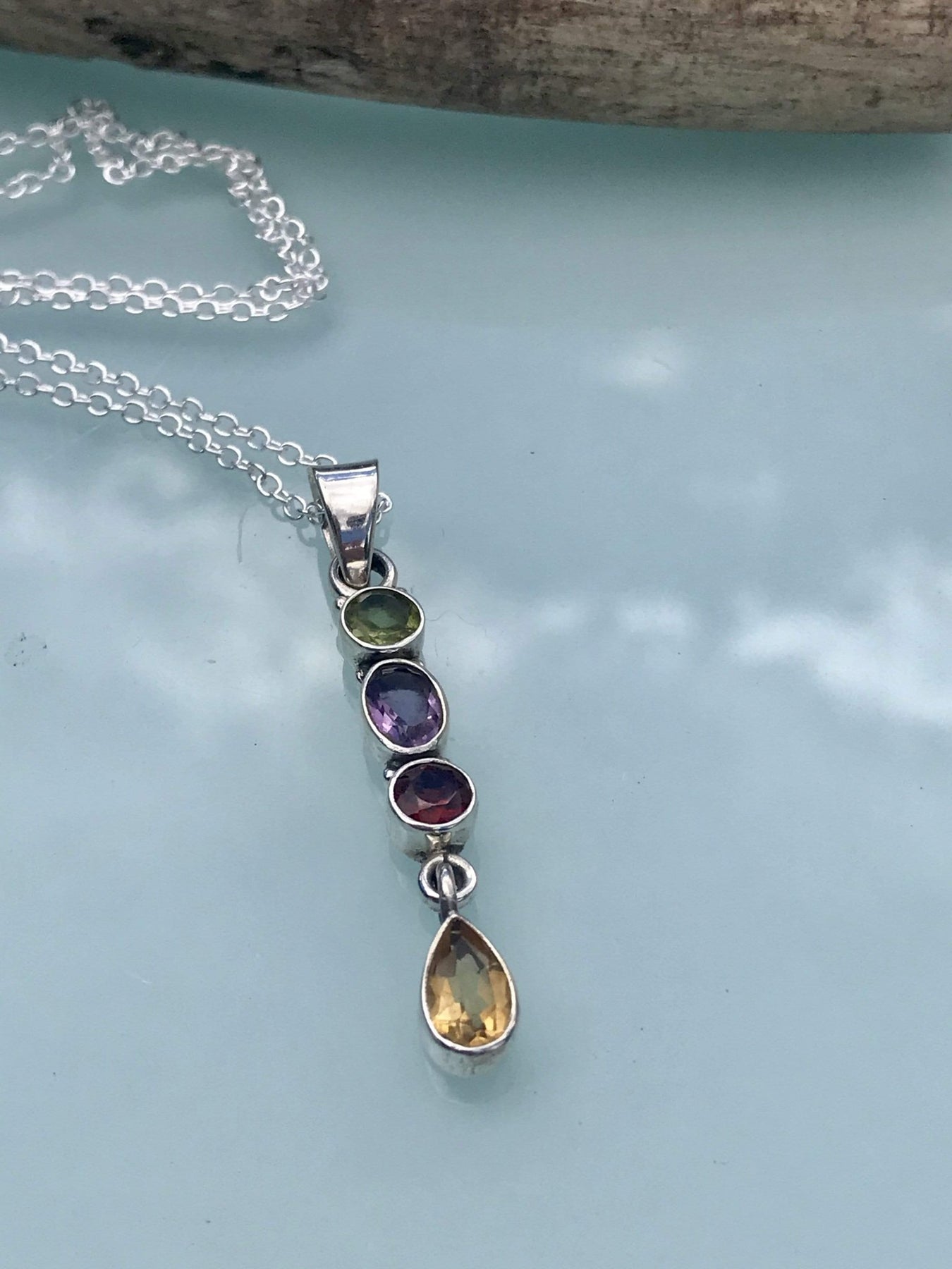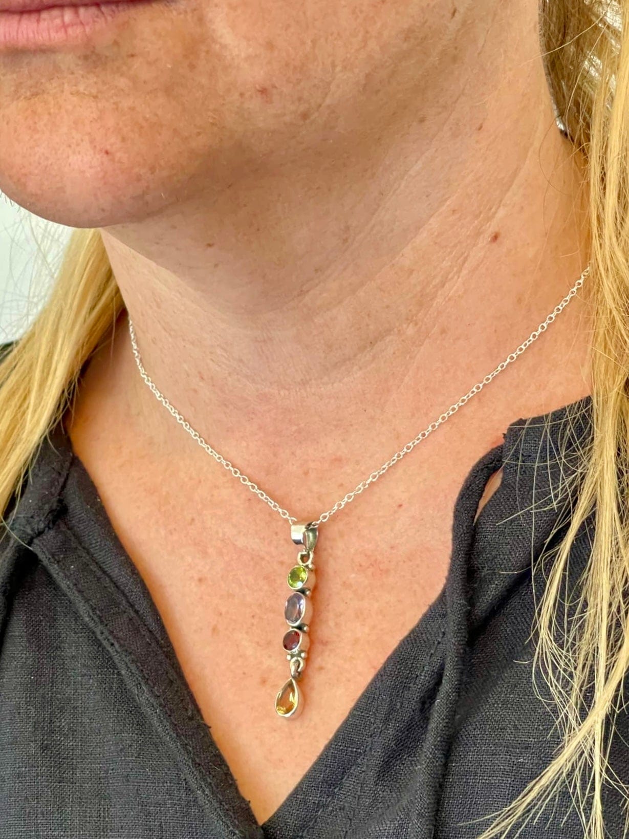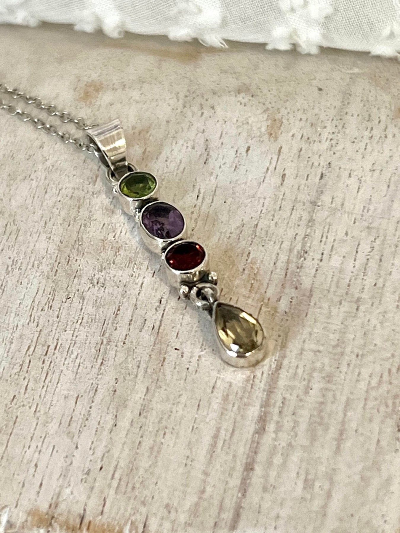 We've made the prettiest pendant in Peridot, Aquamarine, Garnet and Citrine and by hand set all of these gorgeous gems in a Sterling Silver bezel and then linked them for an eye catching gemstone pendant.