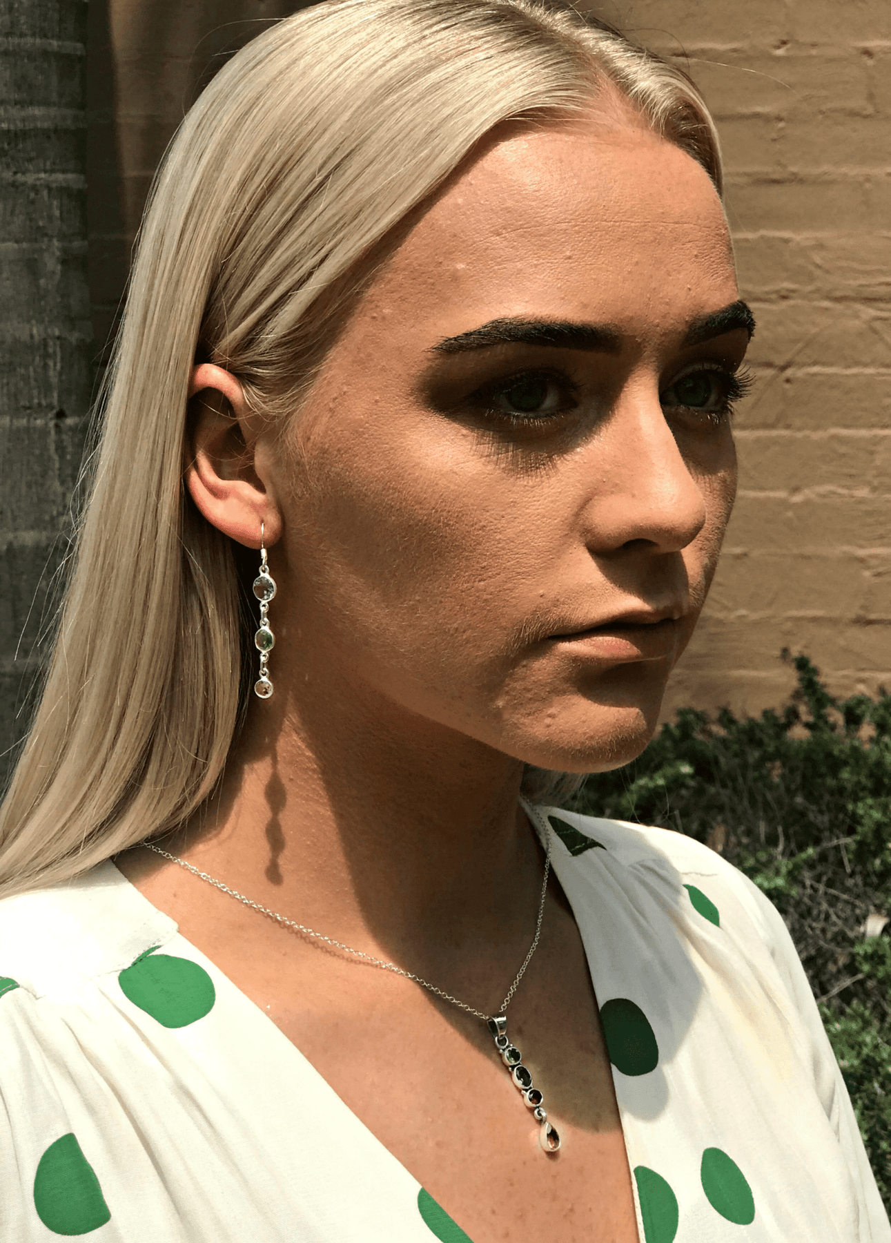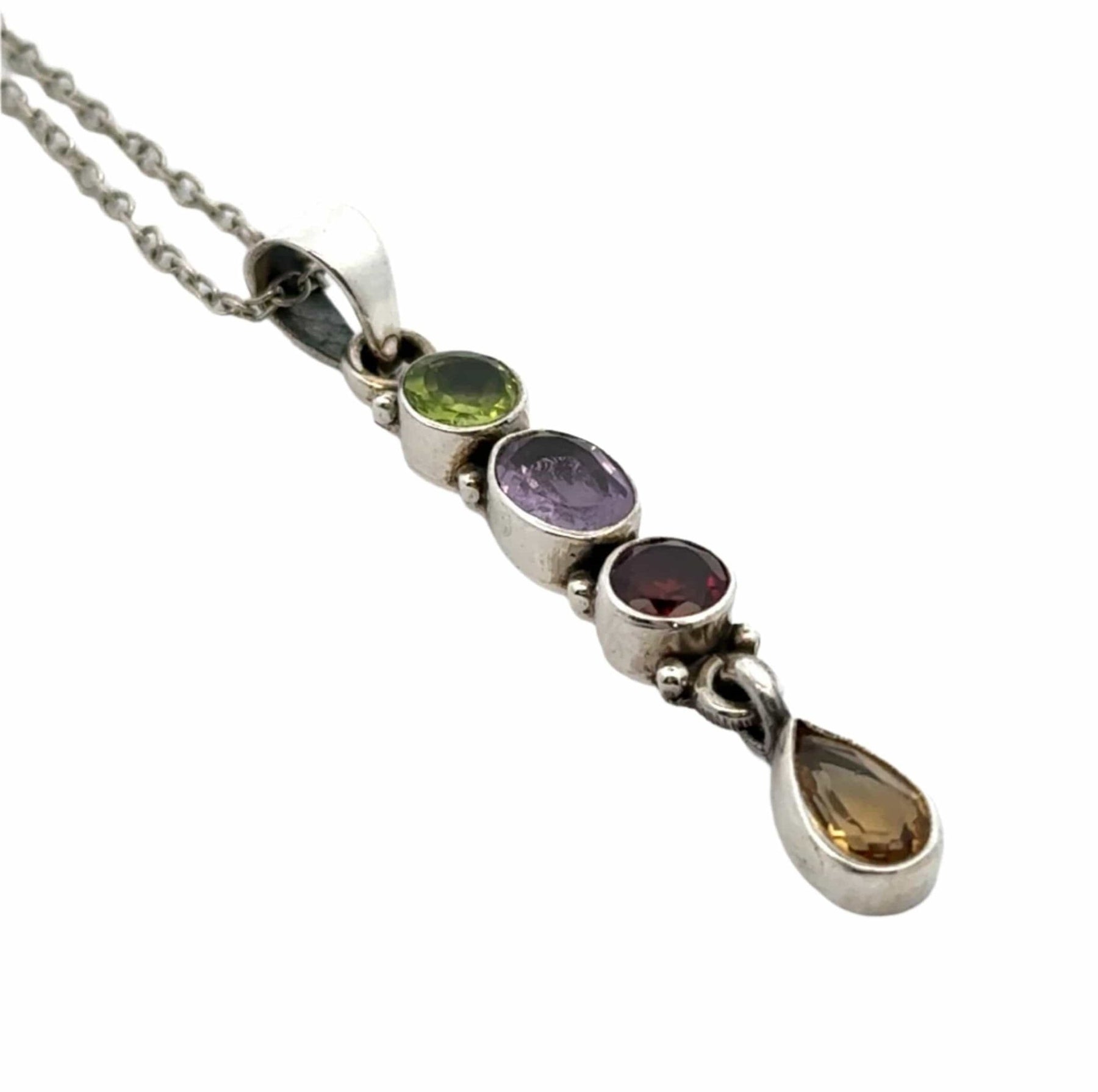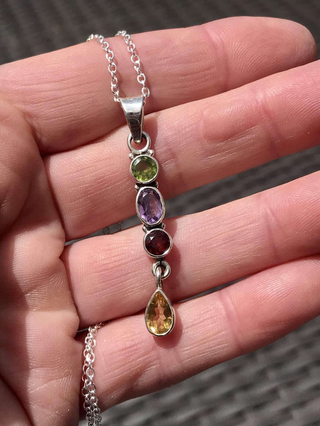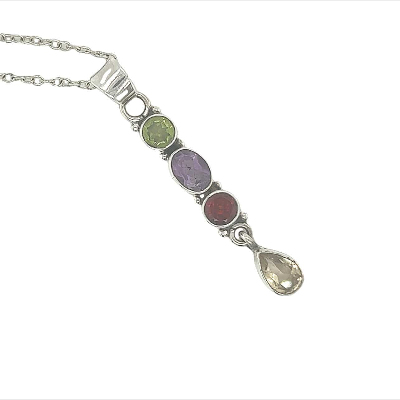We've made the prettiest pendant in Peridot, Aquamarine, Garnet and Citrine and by hand set all of these gorgeous gems in a Sterling Silver bezel and then linked them for an eye catching gemstone pendant.