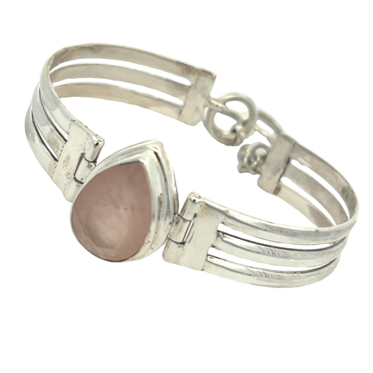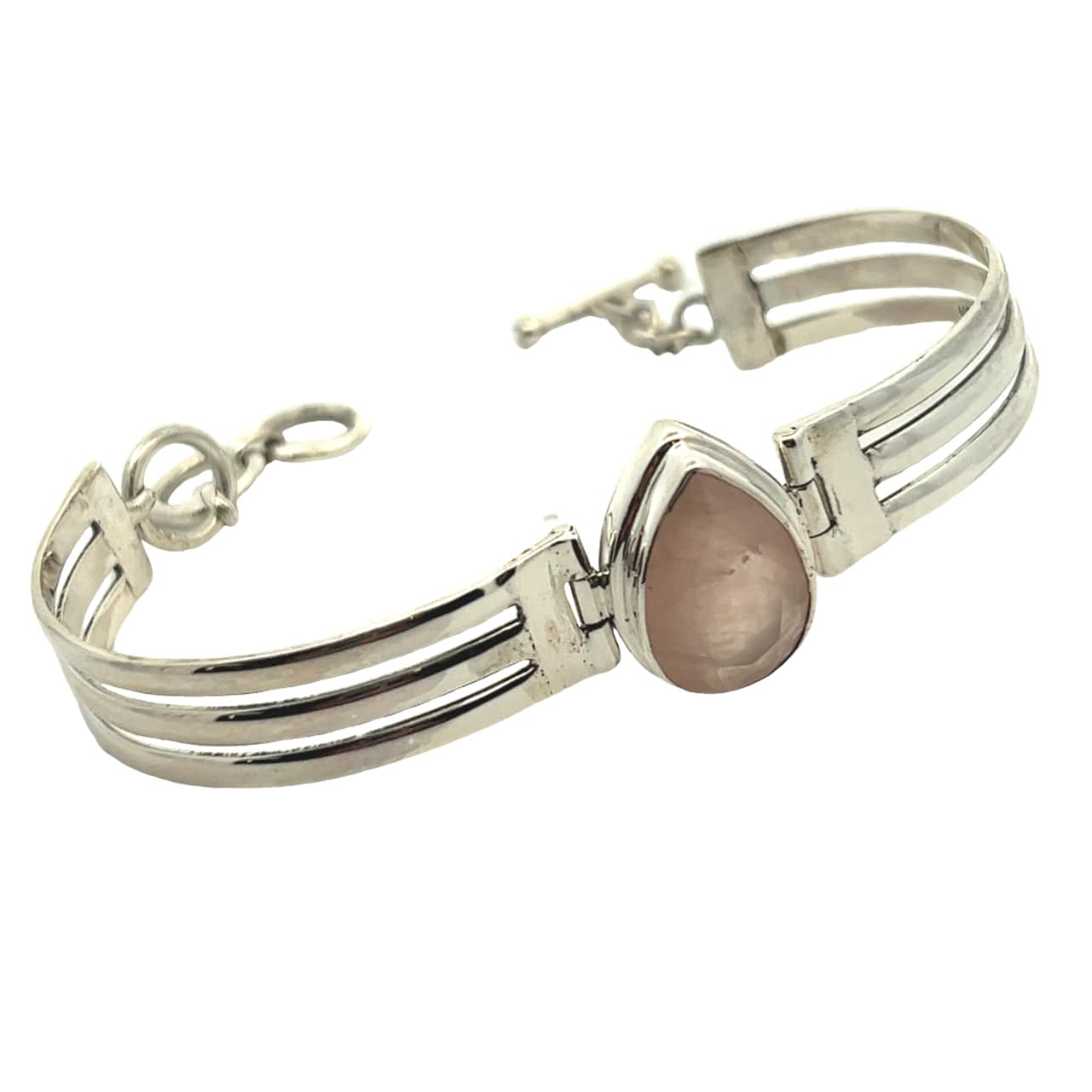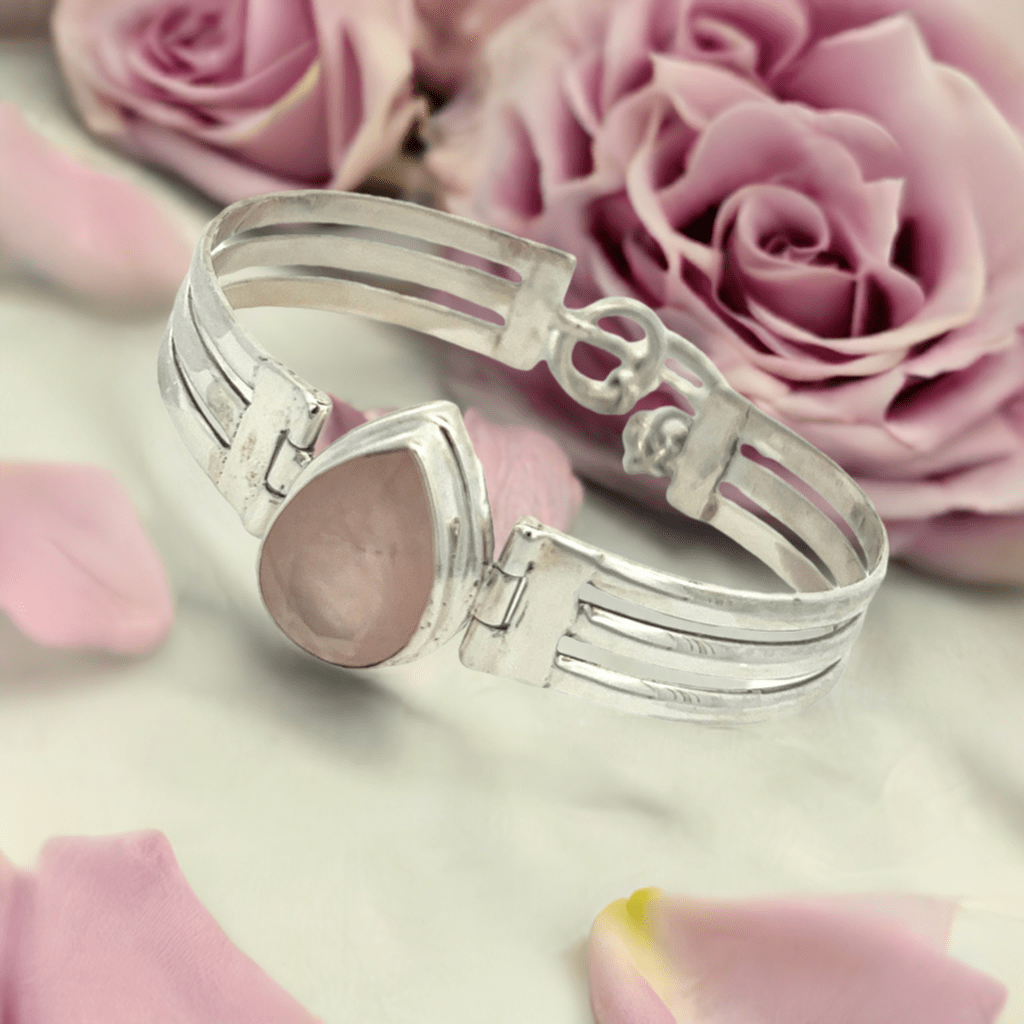 Embrace the gentle elegance of this rose quartz bracelet, where the natural beauty of a 13 x 18 tear drop rose quartz stone takes centre stage.