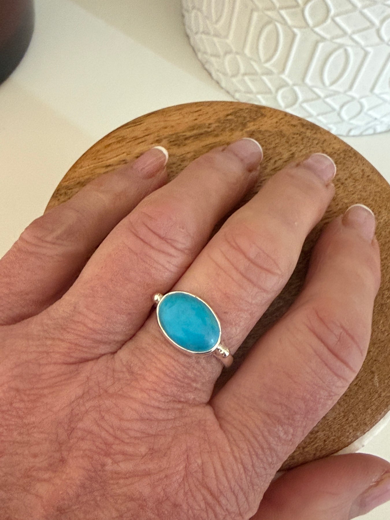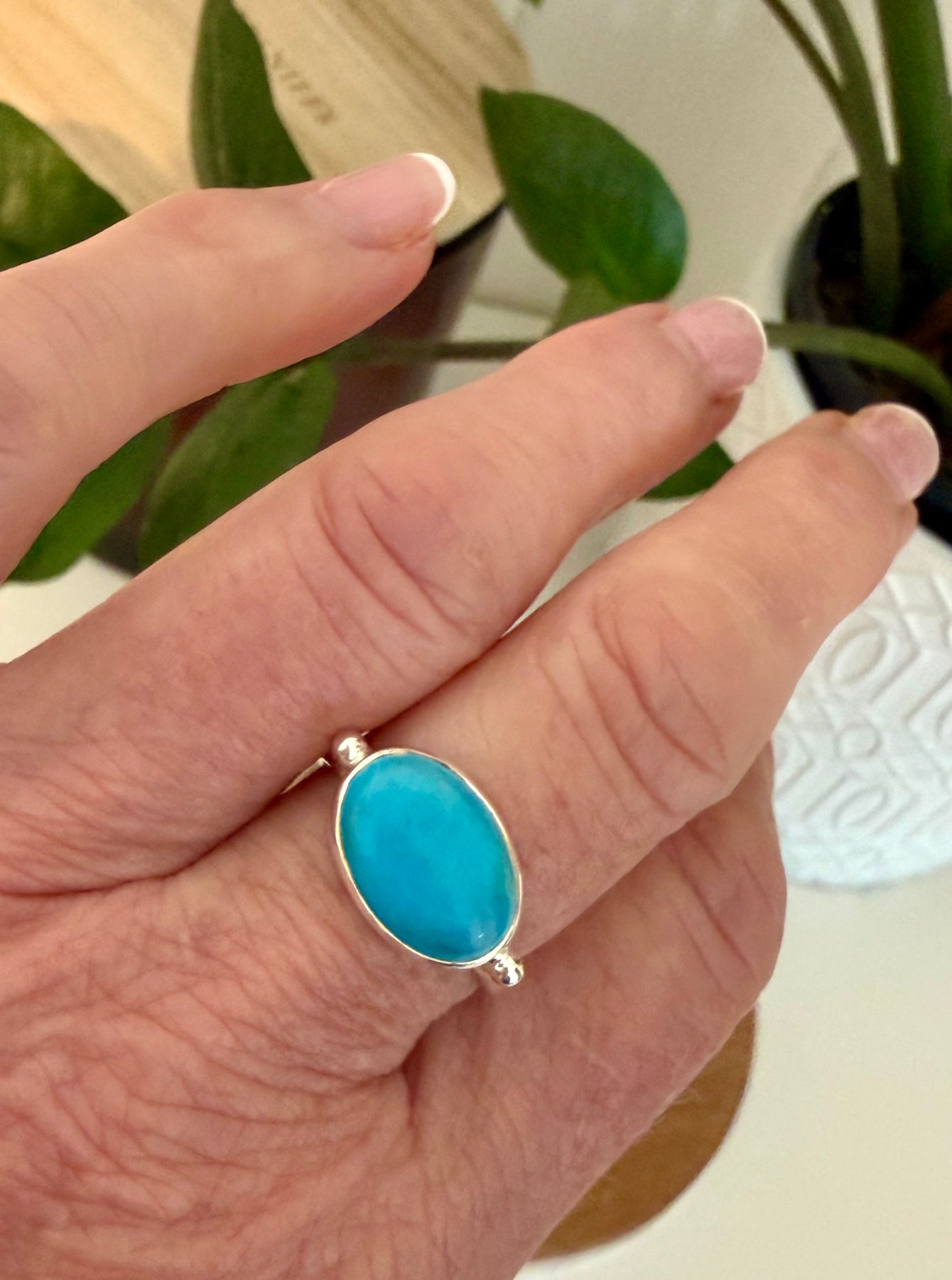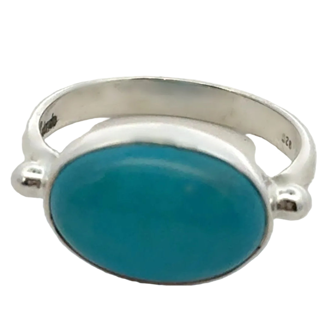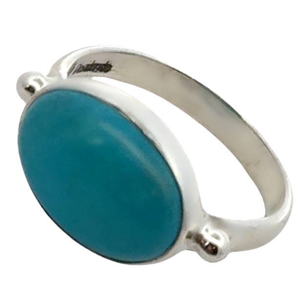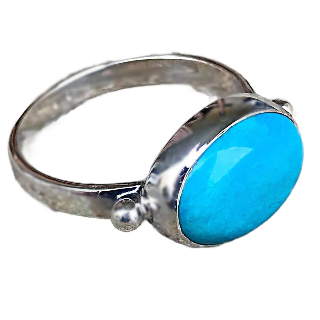 This turquoise ring is a 10 x 14 MM cabochon turquoise and set in shiny sterling silver. Perfect with a white dress in summer or to brighten up any day.
